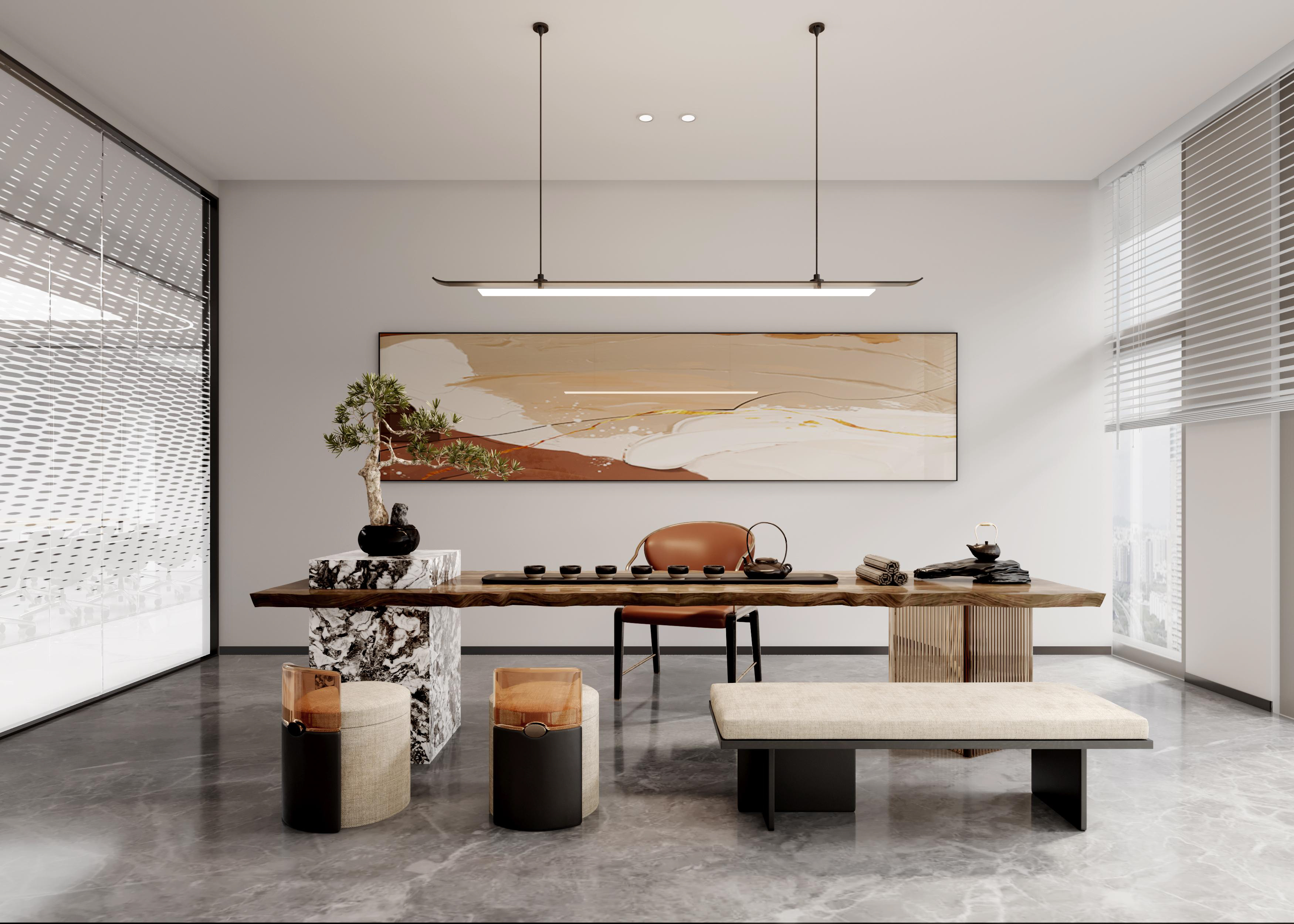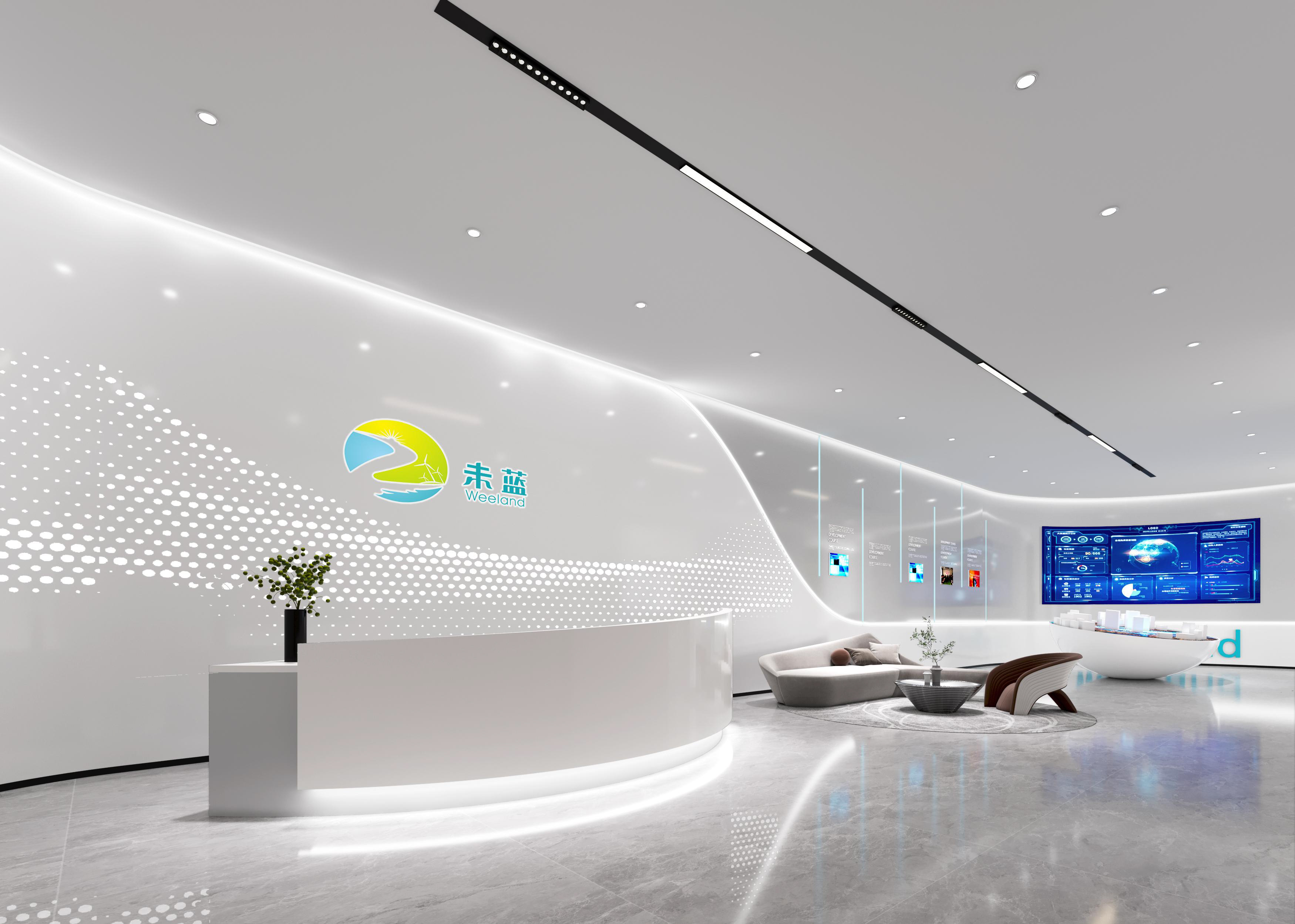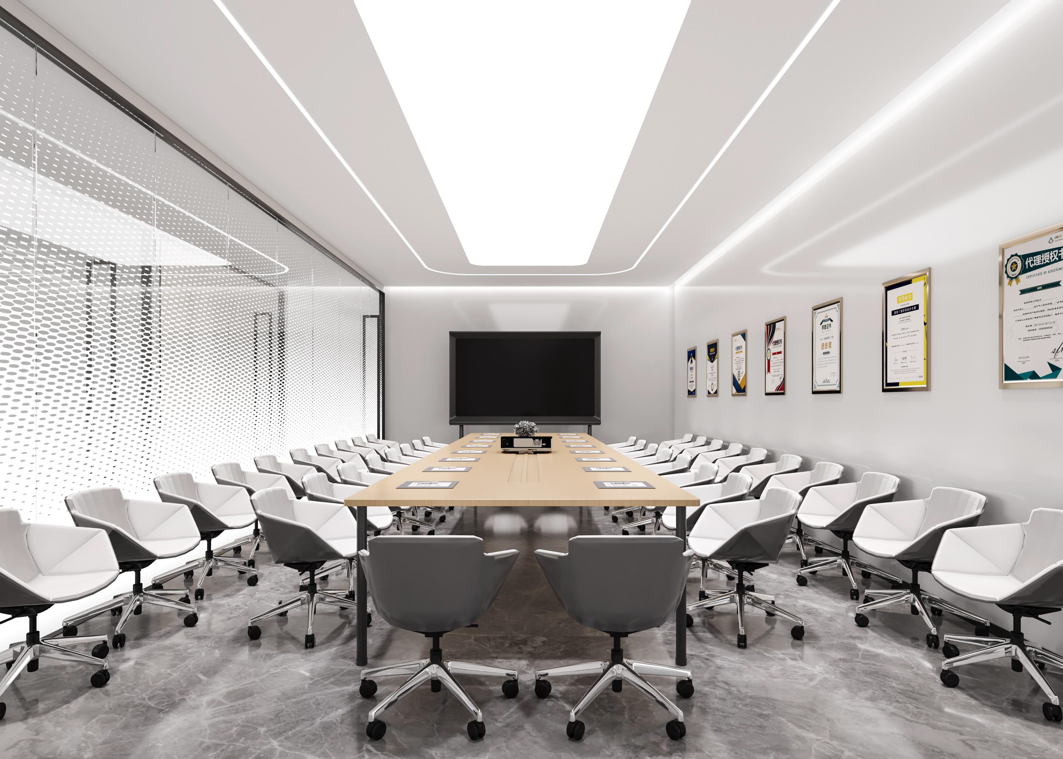 冷色為主色調(diào),營造簡約、現(xiàn)代感,光點增加動態(tài)感,增添活力。隱藏式照明,減少視覺上的雜亂,空間看起來更加簡潔。開放式辦公室,使空間開闊,玻璃隔斷,增加了辦公空間的通透、明亮。