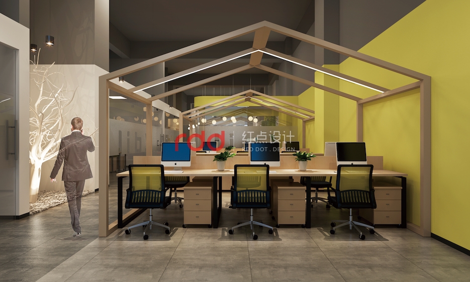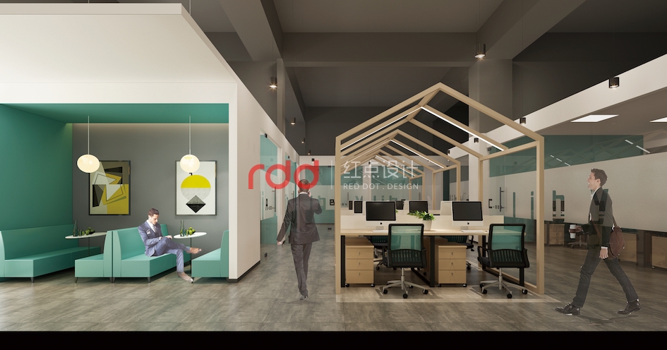 共享辦公區(qū)是最活躍且最具代表性的空間。設(shè)計(jì)師在每組卡座的上方設(shè)計(jì)了一個(gè)房子的造型,仿佛是每個(gè)溫馨的小家。
