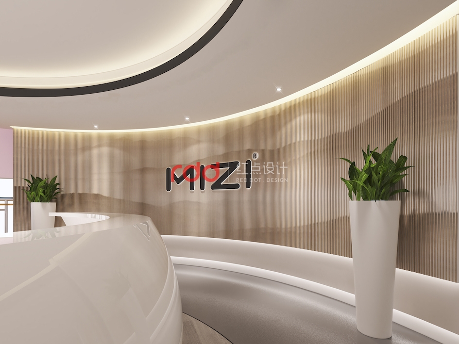 弧線是最能體現(xiàn)女性柔美的特征?;⌒吻芭_(tái)的設(shè)計(jì)猶如含苞待放的少女,亭亭玉立。背景墻上“MIZI”的發(fā)光logo簡(jiǎn)單大氣。