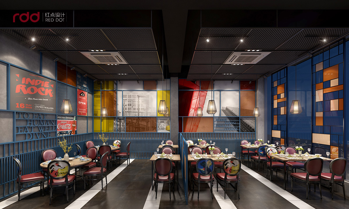 本項(xiàng)目的私房菜設(shè)計(jì),紅點(diǎn)裝飾的設(shè)計(jì)師運(yùn)用工業(yè)風(fēng)與蒙德里安紅黃藍(lán)的經(jīng)典構(gòu)圖的的碰撞。根據(jù)蒙德里安直線與橫線的構(gòu)圖原則,室內(nèi)全部運(yùn)用直線與橫線的穿插結(jié)構(gòu),前臺(tái)是淺色木飾面與黑色不銹鋼的搭配,加上素水泥的墻面,在暖黃的燈光下,有一種純粹而溫暖的感覺。