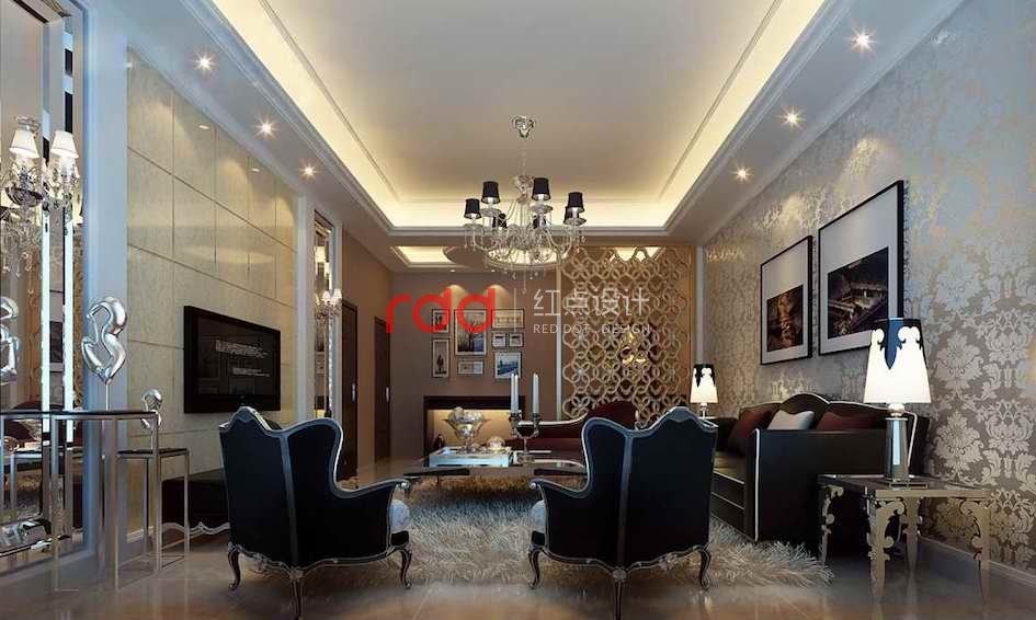 高雅而和諧是新古典的代名詞??蛷d內(nèi)米黃色仿大理石地面和電視背景墻,簡潔大方,歐式花紋墻紙和隔斷在燈光照射下,使整個空間溫馨滿滿。帶歐式花紋及金屬材質(zhì)的家具高貴典雅。