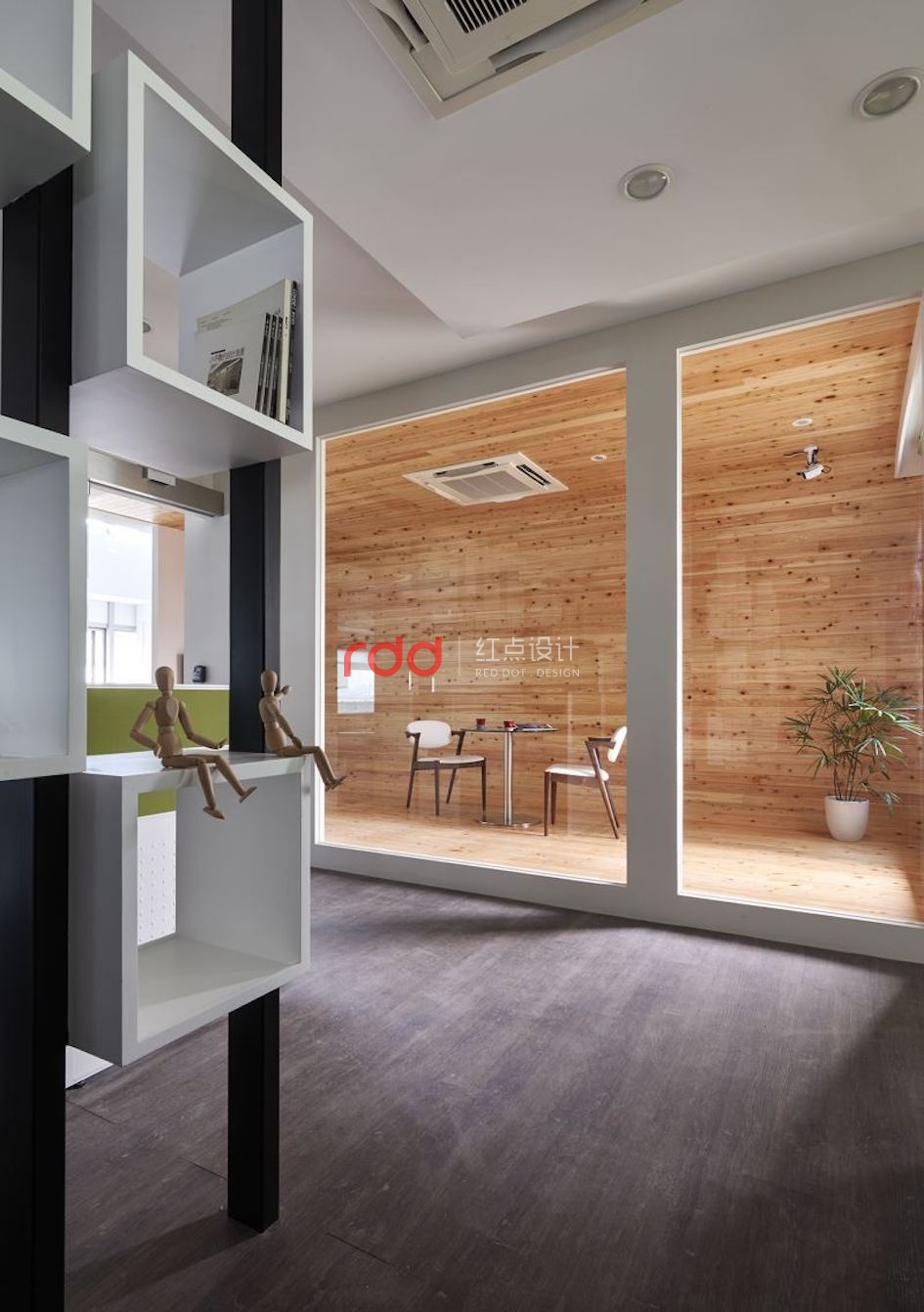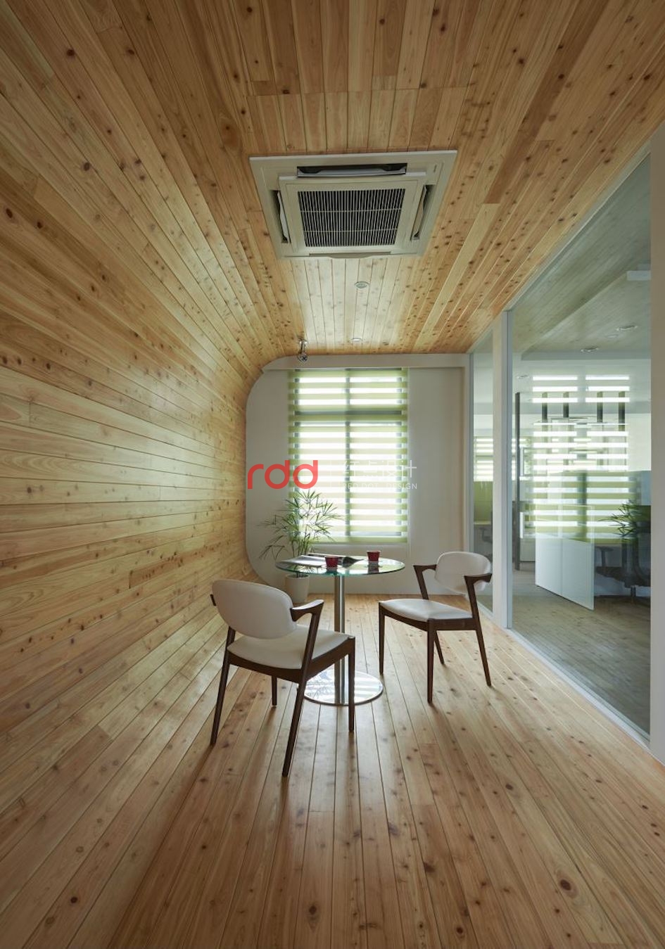 而接待洽公者的待客區(qū),從地面、墻面,一直延伸至天花板,以檜木板鋪設(shè)出像是被森林包圍的放松氛圍,另外再搭配整面玻璃墻增加場域穿透性,讓旁邊的辦公室也能看見這個療愈感滿分的美好領(lǐng)域。走上懸空樓梯,設(shè)計(jì)師在主空間設(shè)計(jì)以樹木為意象的大型藝術(shù)裝置,搭配木紋地板,將木質(zhì)感所帶來的潤和氣息擴(kuò)散到每個角落,輸入自然人文的氣韻。