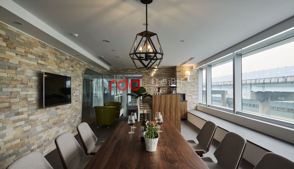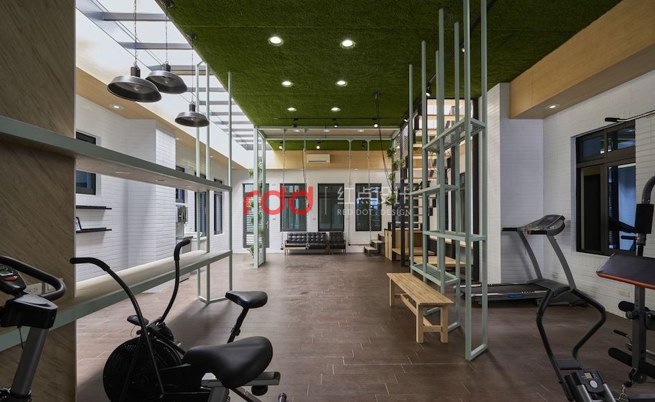 工作累了,還能和同事到咖啡館休息一下,咖啡館以暖色系文化石鋪排溫馨感,加上大面窗戶引進(jìn)柔和自然光,在這里喝杯咖啡,舒緩工作的緊張心情吧!特地為員工打造的健身室與休閑區(qū),不做滿的天花以玻璃罩保留采光,漆上蘋果綠的鐵件取代實(shí)體梁柱帶來輕盈感,視覺上也更加開闊。除了擺上綠色盆栽,設(shè)計(jì)師讓綠意繼續(xù)蔓延,將草皮鋪到天花板上,增加空間中的生命感。