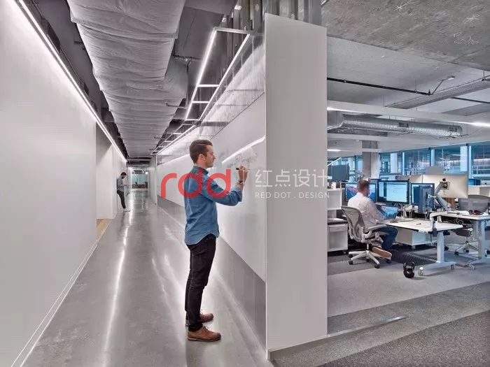Rapt 工作室設(shè)計(jì)了一種改進(jìn)的地板系統(tǒng)和移動設(shè)備,讓員工毫不費(fèi)力地根據(jù)手頭的任務(wù)重新配置工作區(qū)域。另外還配有可寫的墻壁,展示墻提供空間給員工來收集和討論項(xiàng)目。