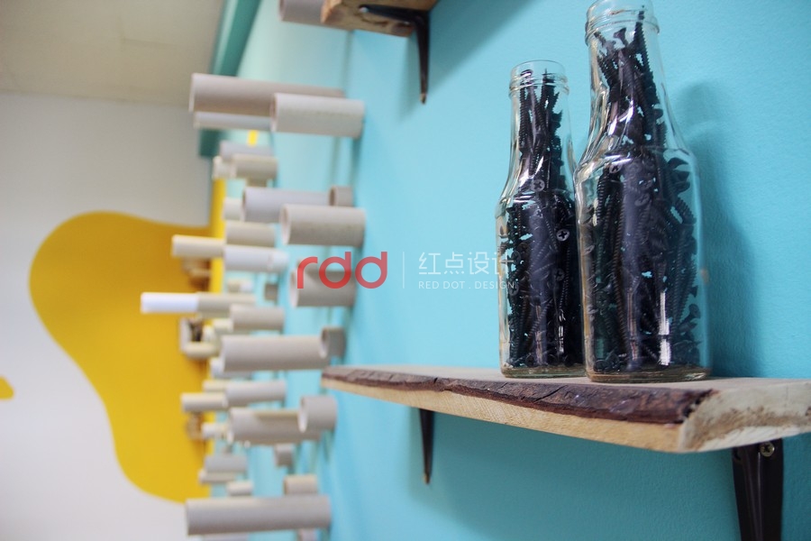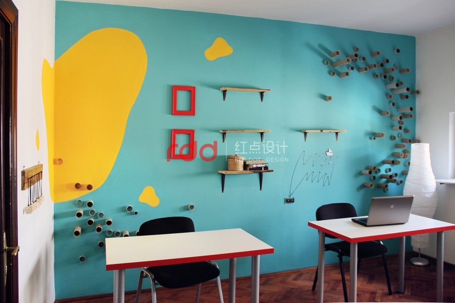 其中的一個(gè)房間,設(shè)計(jì)師在厚木板制作的書(shū)桌上運(yùn)用玻璃覆蓋,設(shè)計(jì)了兩個(gè)非常有趣的書(shū)桌。為了創(chuàng)造更多個(gè)性化設(shè)計(jì),設(shè)計(jì)師運(yùn)用家具、小擺飾,懷舊飾品打造獨(dú)特的空間。墻面上的架子是用和書(shū)桌相同材質(zhì)的木板所制作的。另外一個(gè)房間延續(xù)了相同的風(fēng)格,使用了一樣的顏色以及墻壁裝飾。房間墻面上的圓筒造型的紙板管,是非常具有創(chuàng)意的設(shè)計(jì),當(dāng)窗外的陽(yáng)光透入室內(nèi),搭配鮮艷色調(diào)的墻面,創(chuàng)造一個(gè)活力十足的個(gè)性化空間。在休息室內(nèi),擺放了桌上足球桌并且規(guī)畫(huà)了和其他空間一樣的有趣桌子。不同的材質(zhì)、工具創(chuàng)造不同的有趣設(shè)計(jì)。