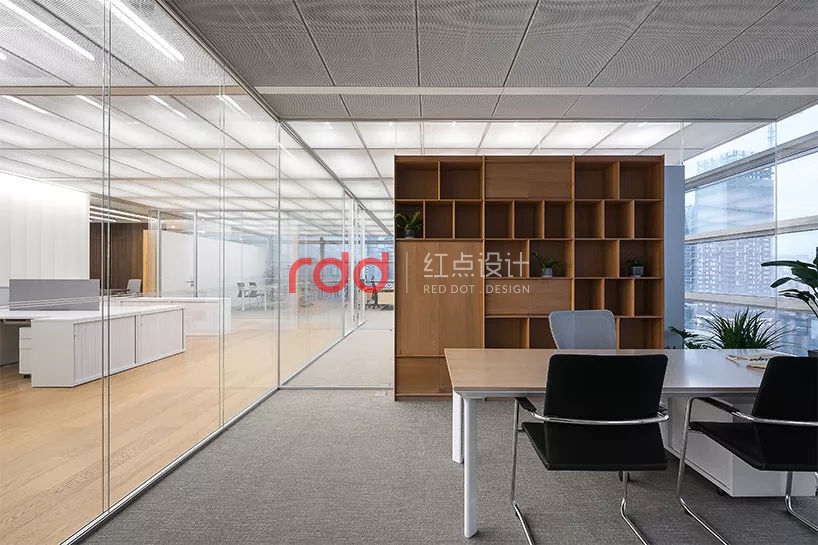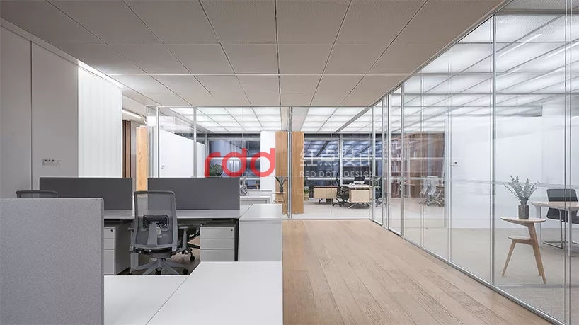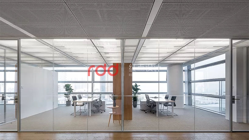 所有辦公室和會(huì)議室均采用雙層超白玻璃隔斷,保證隔音的同時(shí)將自然光和視線(xiàn)交流最大限度引入內(nèi)側(cè)大空間。