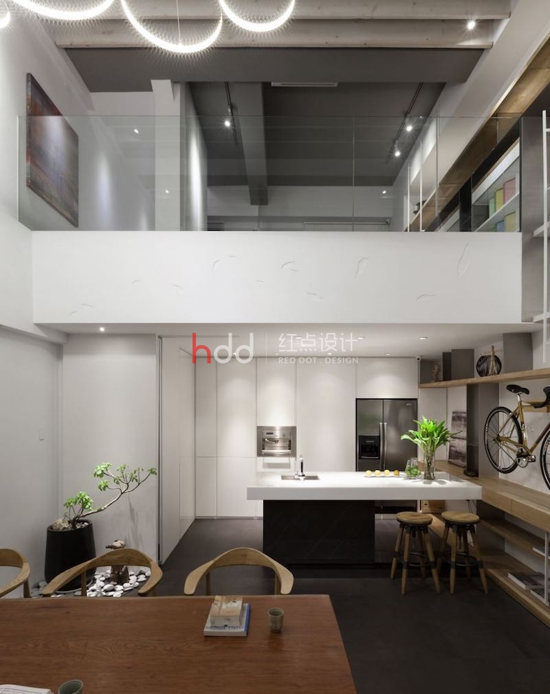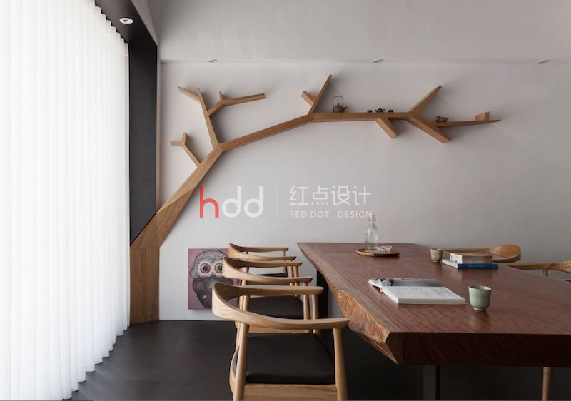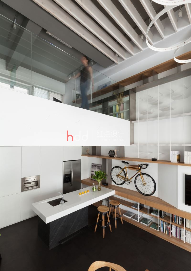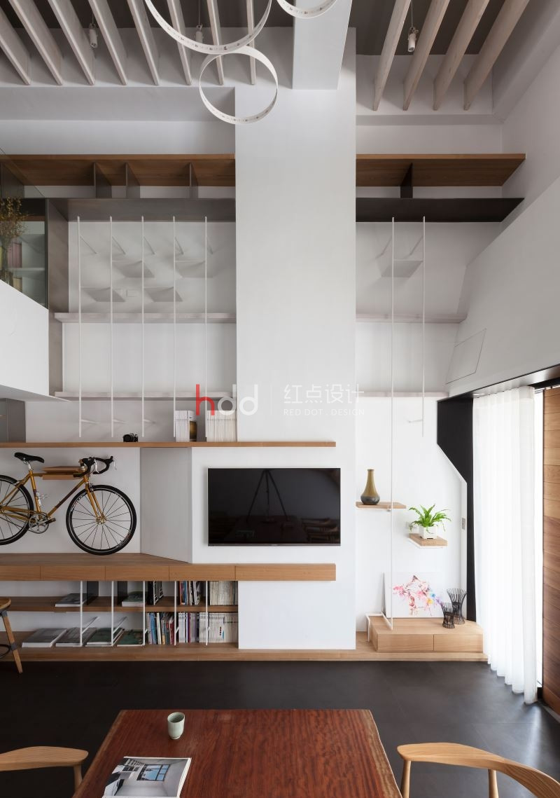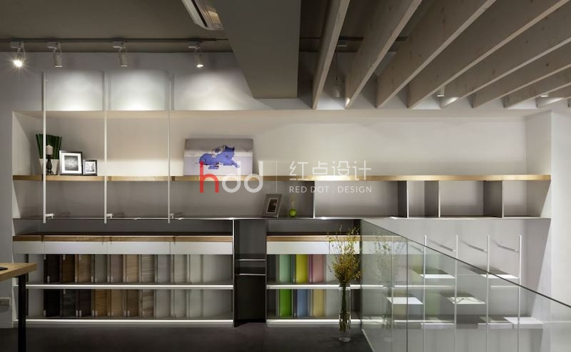 利用復(fù)層堆疊延伸尺度,富含更多樣化的想像可能,開放式空間解構(gòu)格局的限制,輔以透光窗帶進(jìn)的明亮光照,在車水馬龍的市區(qū)中,開拓一處溫煦、休閑的靈感沃土。 紅點(diǎn)建筑+室內(nèi)設(shè)計(jì)的辦公室,以白色作為舒適氛圍的基底,在清爽、明晰中,加入適度的木元素妝點(diǎn),增添溫潤悠閑的特質(zhì)。整體空間利用開放式設(shè)計(jì),包納辦公、會客及建材展示的多重機(jī)能性,并延伸中島、洽談,和夾層處的辦公桌,一旁的墻面納入收納展示機(jī)能,結(jié)合鐵件和木作,相互交錯的層板、線條,延伸至二樓,形成獨(dú)特的端景墻,而挑空設(shè)計(jì)不僅放大了視野,也允許了不同視角的駐足、觀賞,讓靈感也能隨著開闊的視域,更加自由靈活不受局限。