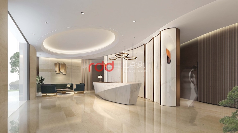步入大堂,層層疊疊的弧形天花猶如海浪,條條整齊的仿木紋鋁格柵如竹子。白色弧形大理石背景墻及異型大理石前臺(tái)仿佛帆船一樣在破浪前行。“長(zhǎng)風(fēng)破浪會(huì)有時(shí),直掛云帆濟(jì)滄海?!敝杏腿欢?。