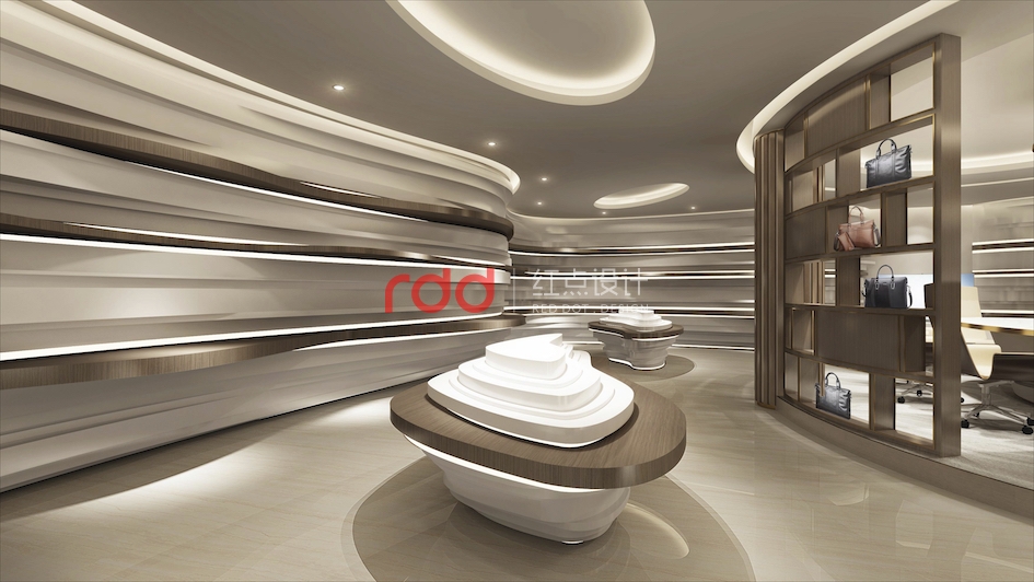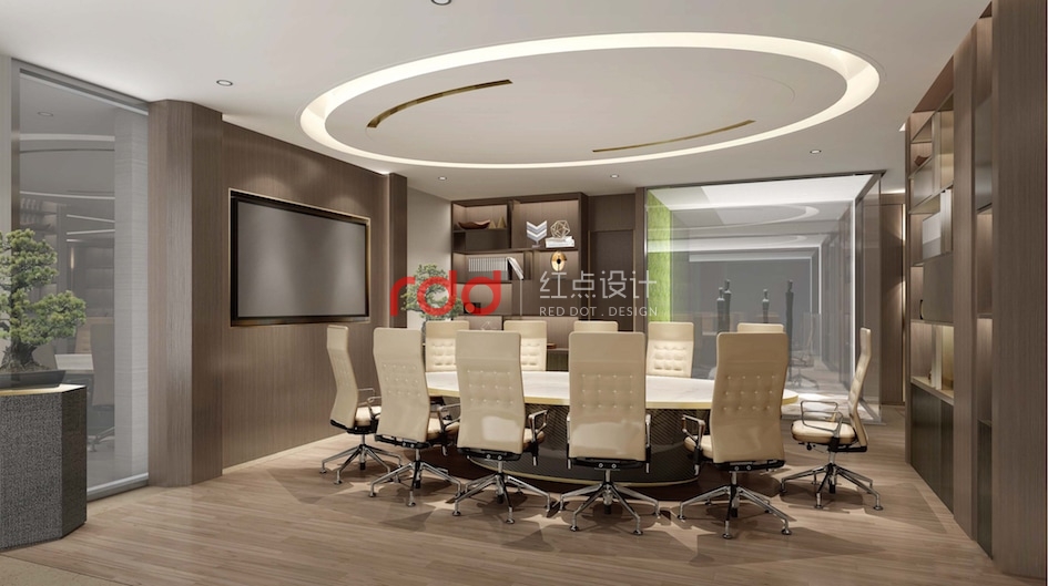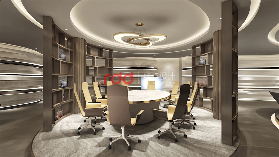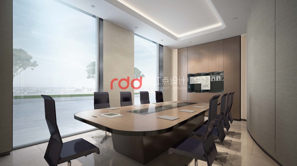 會(huì)議區(qū),橢圓的造型天花與橢圓的會(huì)議桌相互呼應(yīng),旁邊還有酒柜及端景區(qū), 經(jīng)過(guò)瘋狂的頭腦風(fēng)暴以后,欣賞著窗外的美景品嘗著美酒,這也不失是一份忙里偷閑的愜意享受。