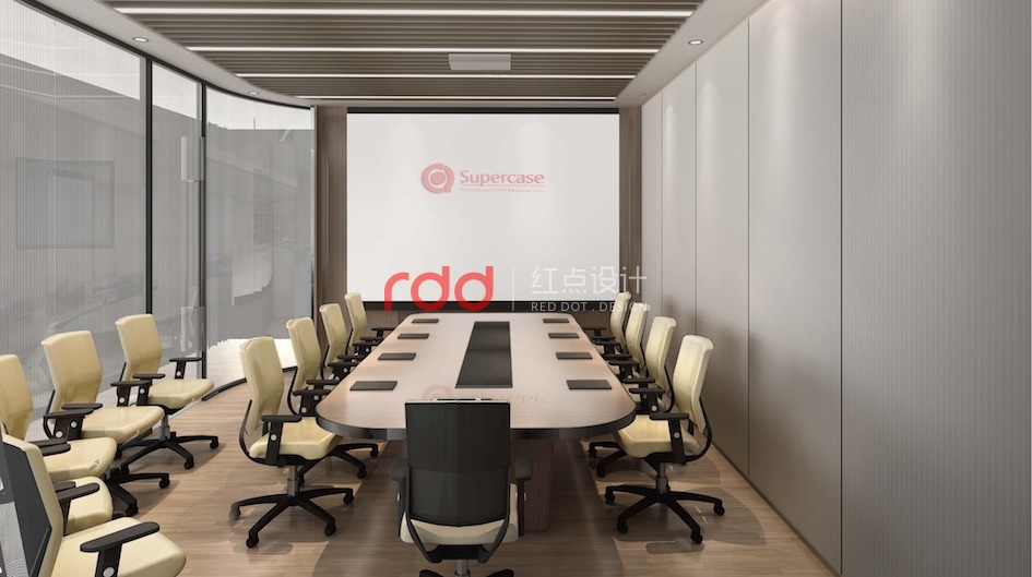 會(huì)議室及財(cái)務(wù)辦公室的工作氛圍是比較嚴(yán)謹(jǐn)?shù)?,因此在設(shè)計(jì)上運(yùn)用比較常規(guī)的設(shè)計(jì)手法,家具的運(yùn)用上選用沉穩(wěn)大方暖木色家具,條形鋁格柵從室外一直延伸到室內(nèi)。