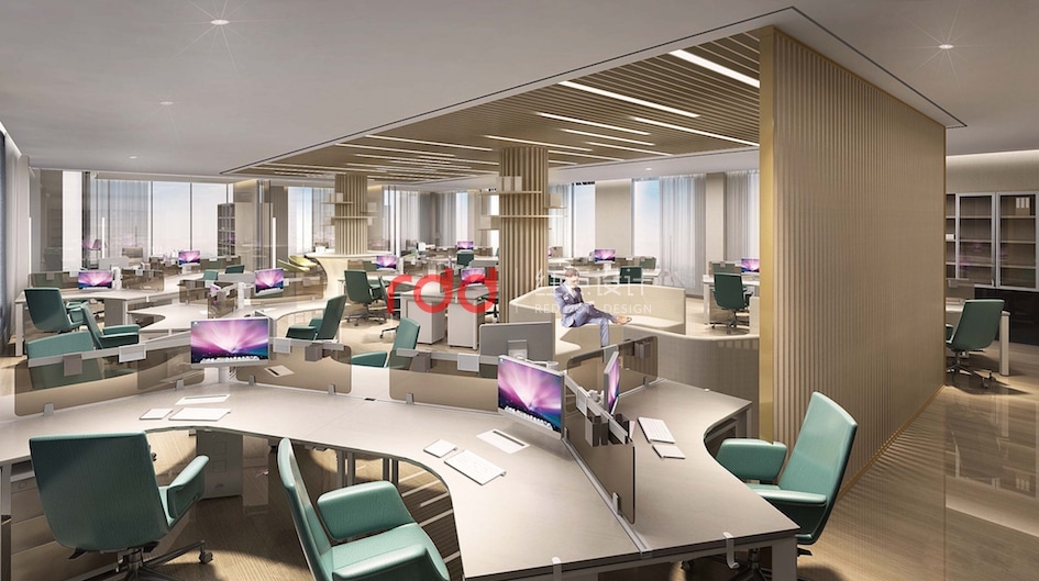 通過(guò)對(duì)二層辦公區(qū)動(dòng)線分析,紅點(diǎn)裝飾設(shè)計(jì)的設(shè)計(jì)師以多邊形為元素,在開(kāi)放辦公區(qū)運(yùn)用不同多邊形拆分、組合,形成一個(gè)相對(duì)活躍的辦公空間,仿木紋鋁格柵從天花一直延伸到立面,圍合成一個(gè)半開(kāi)放半私密的環(huán)境,藍(lán)綠色的椅子為點(diǎn)睛之筆,讓整個(gè)空間增添了幾分樂(lè)趣。