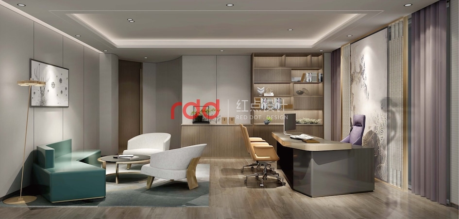 CEO辦公室是三層的重點(diǎn),整個(gè)辦公室內(nèi)辦公、接待、會(huì)議功能俱全,加上陽(yáng)臺(tái)及端景的戶外休閑空間就更加完美了。會(huì)議室與辦公區(qū)運(yùn)用柜子及格柵來(lái)形成一個(gè)既開(kāi)放又相對(duì)獨(dú)立的空間。辦公桌后面的柜子具有收納功能的同時(shí)也兼具裝飾的的效果,這樣的布局在風(fēng)水上有背山靠水,春暖花開(kāi)之意。