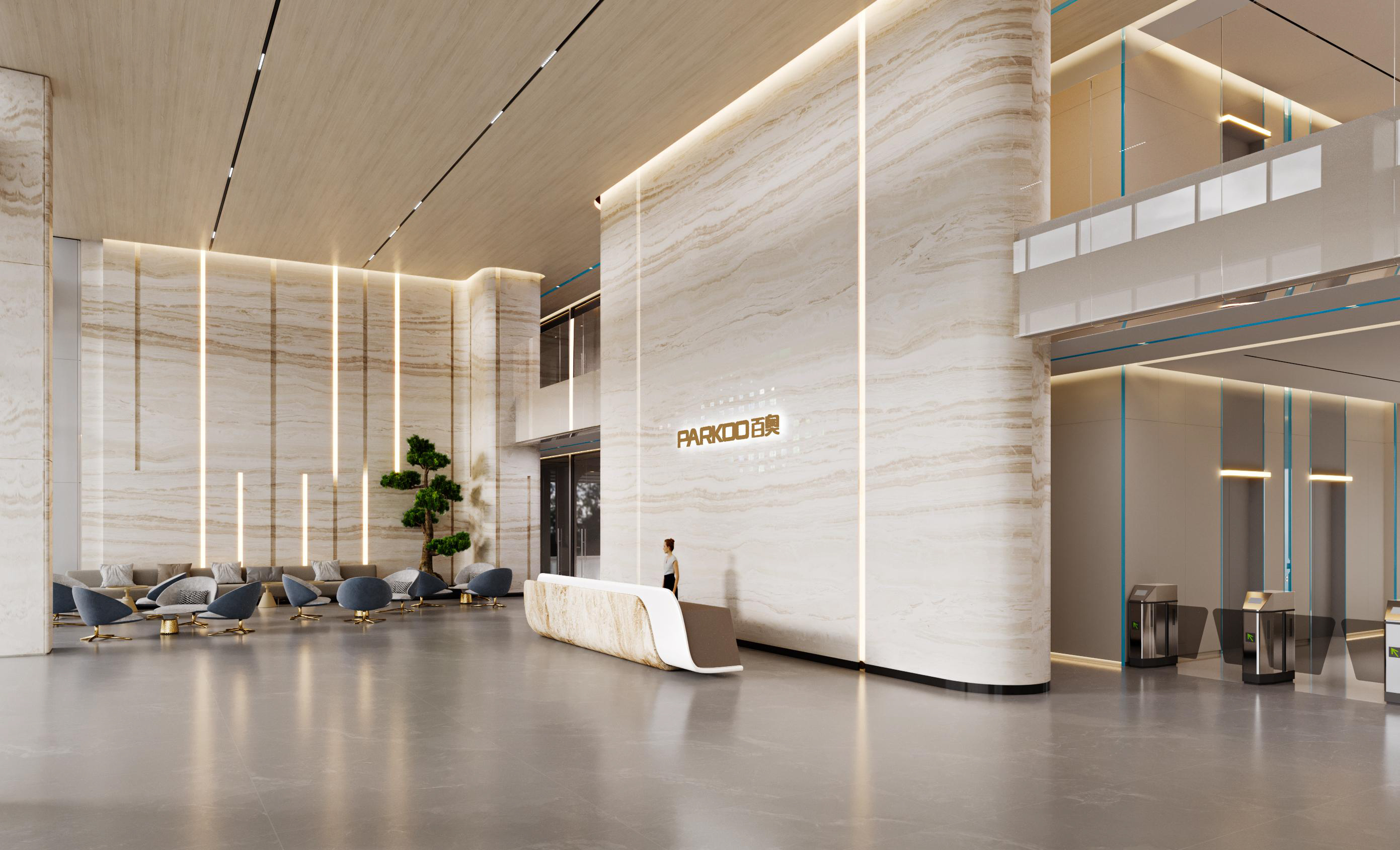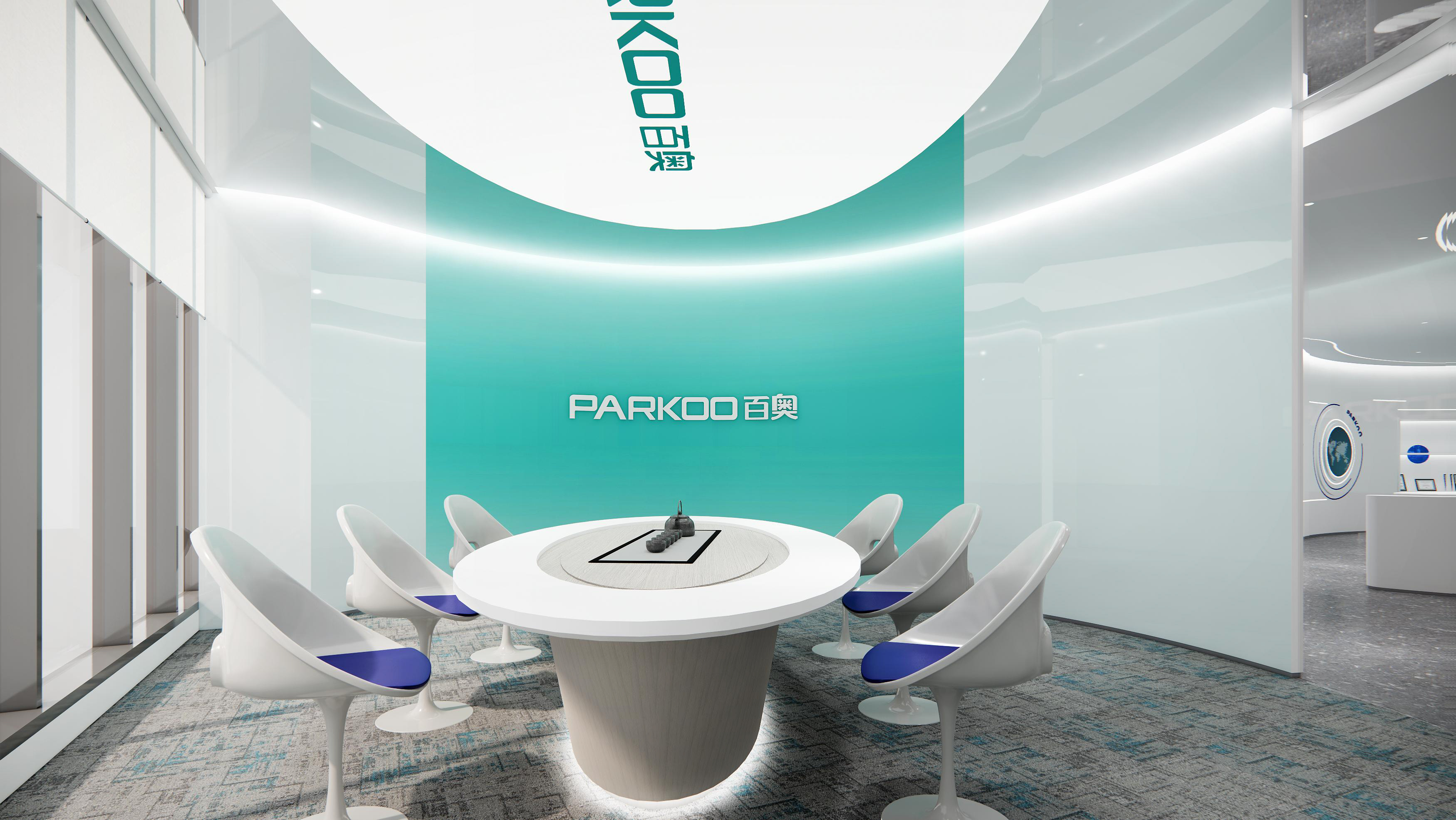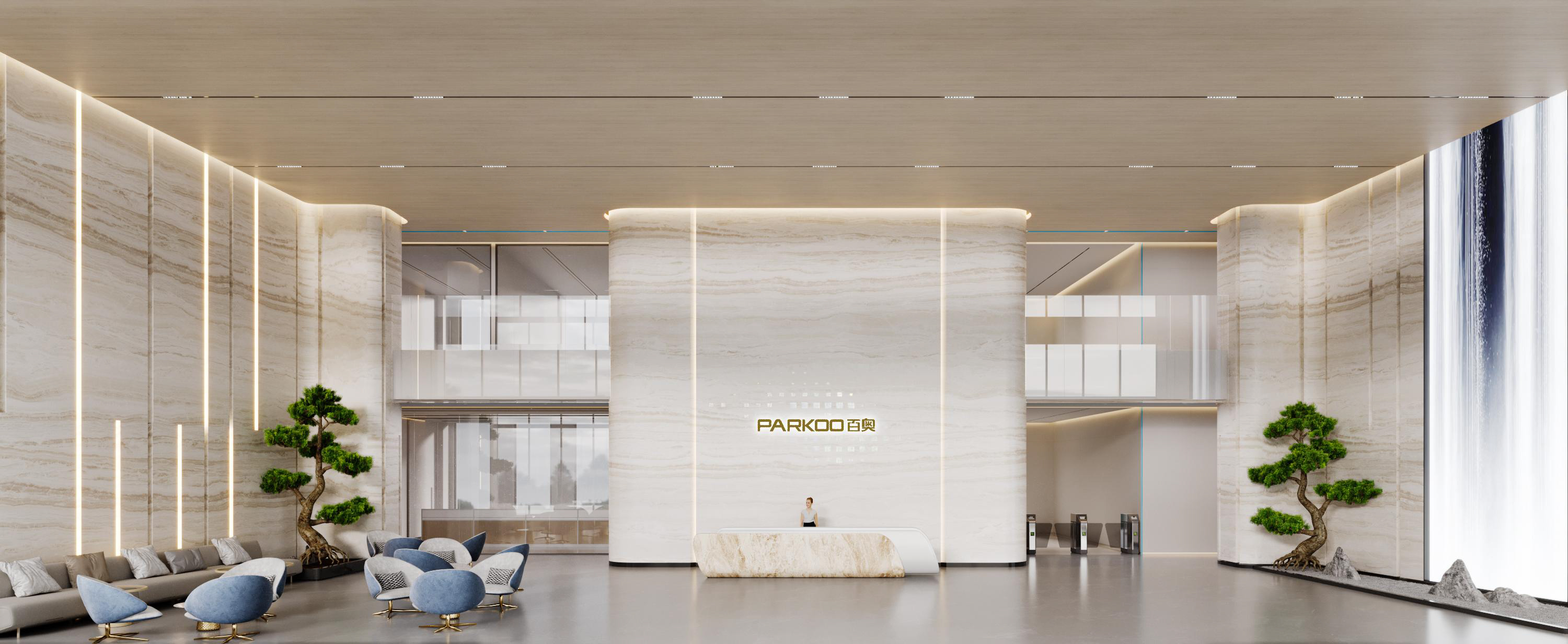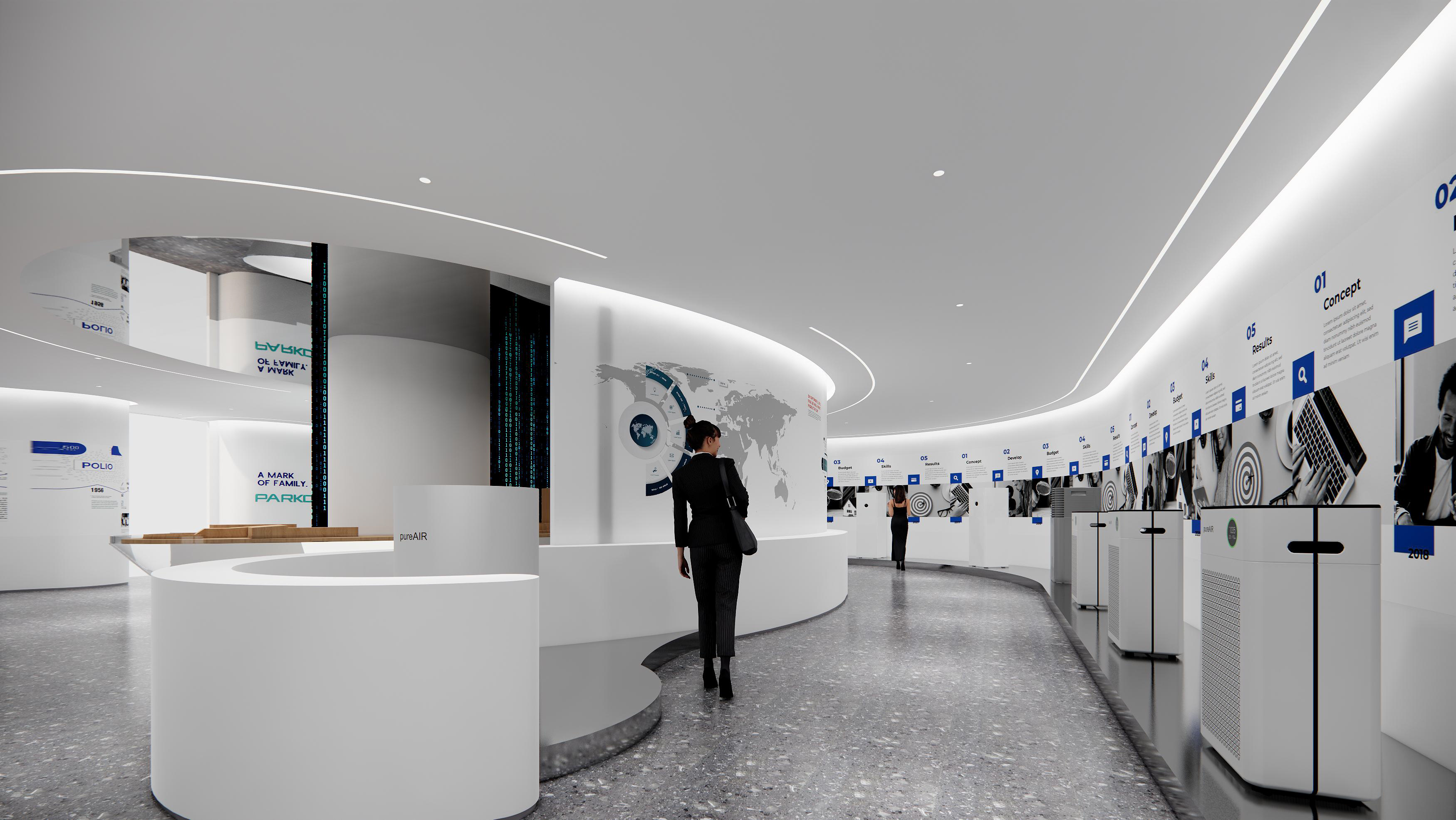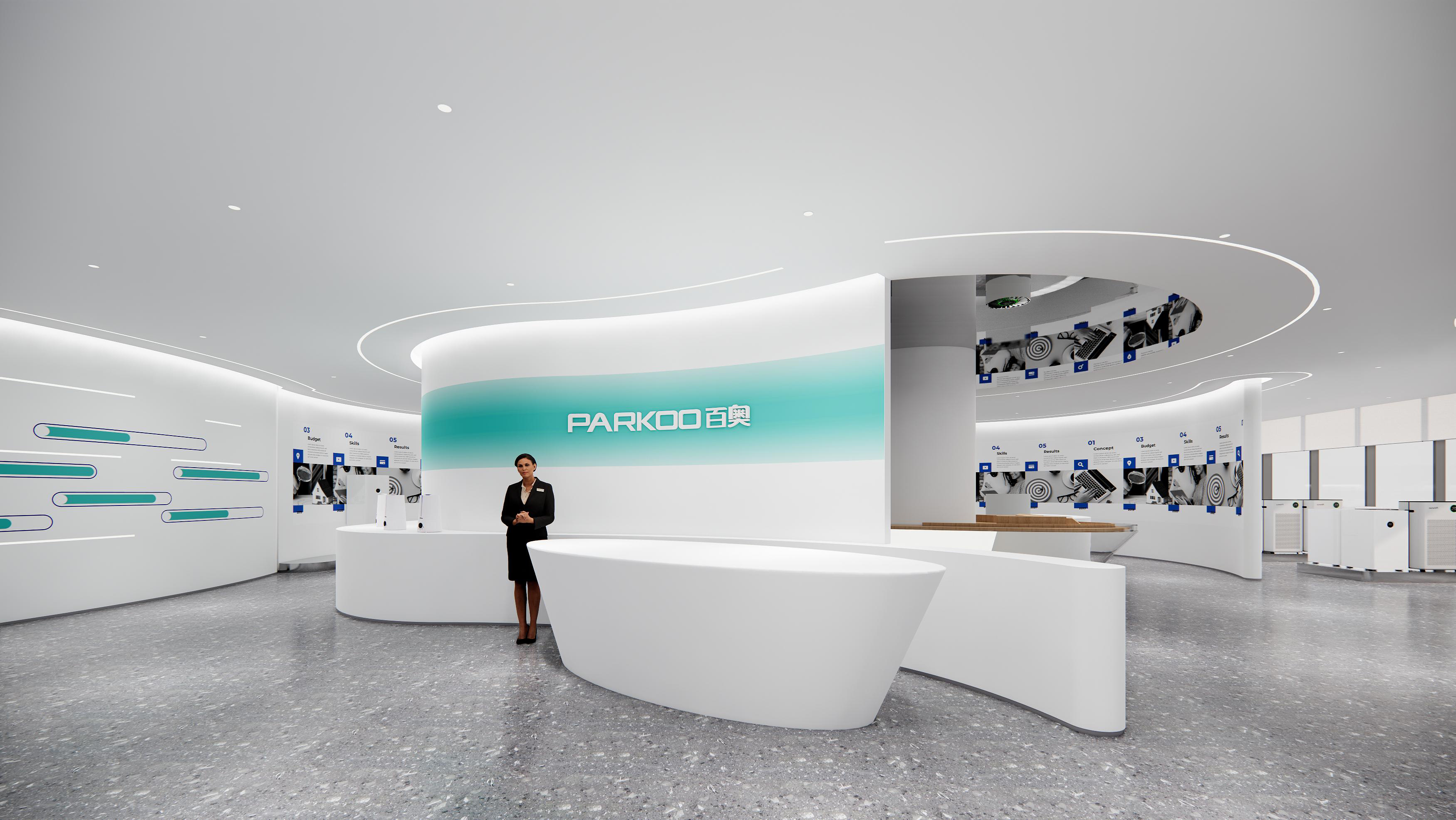 百奧集團(tuán)設(shè)計(jì)思路:前廳以暖色調(diào)為主,打造親和形象。墻壁、前臺(tái)采用紋路瓷磚,和兩側(cè)的綠植、假山等相互映襯,沉穩(wěn)大氣。會(huì)議室白色吊頂和木色家具形成強(qiáng)烈對(duì)比,干凈、簡約。通道用磨砂玻璃作為隔斷,保證隱私性的同時(shí),也增加了通透明亮。電梯間、通道、茶水間等隨處可見的綠植、假山等裝飾,增加了辦公室的自然色彩。展廳以灰白色調(diào)為主,再加上線條以及墻壁的流暢設(shè)計(jì),凸顯了展廳空間的科技感。