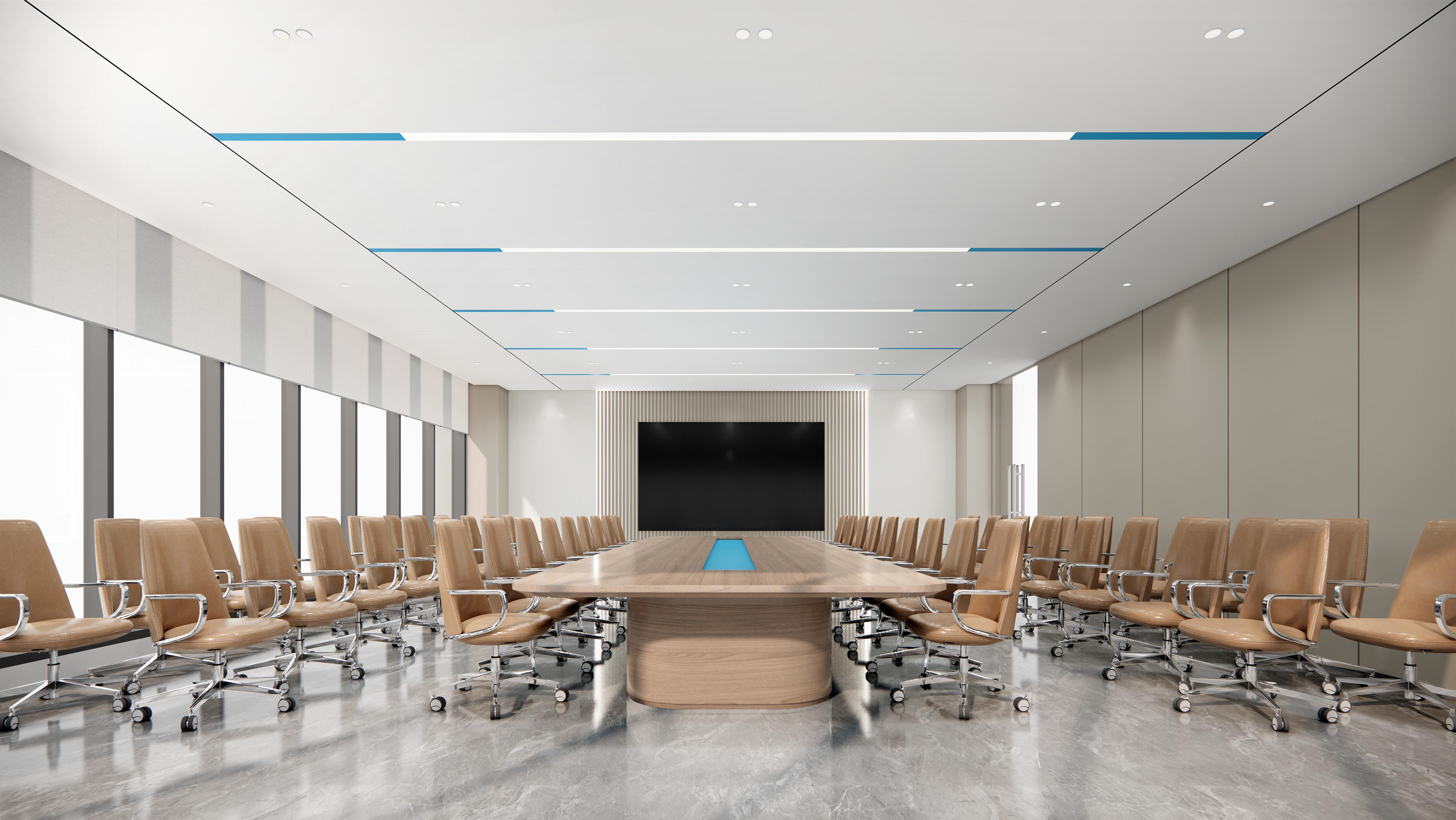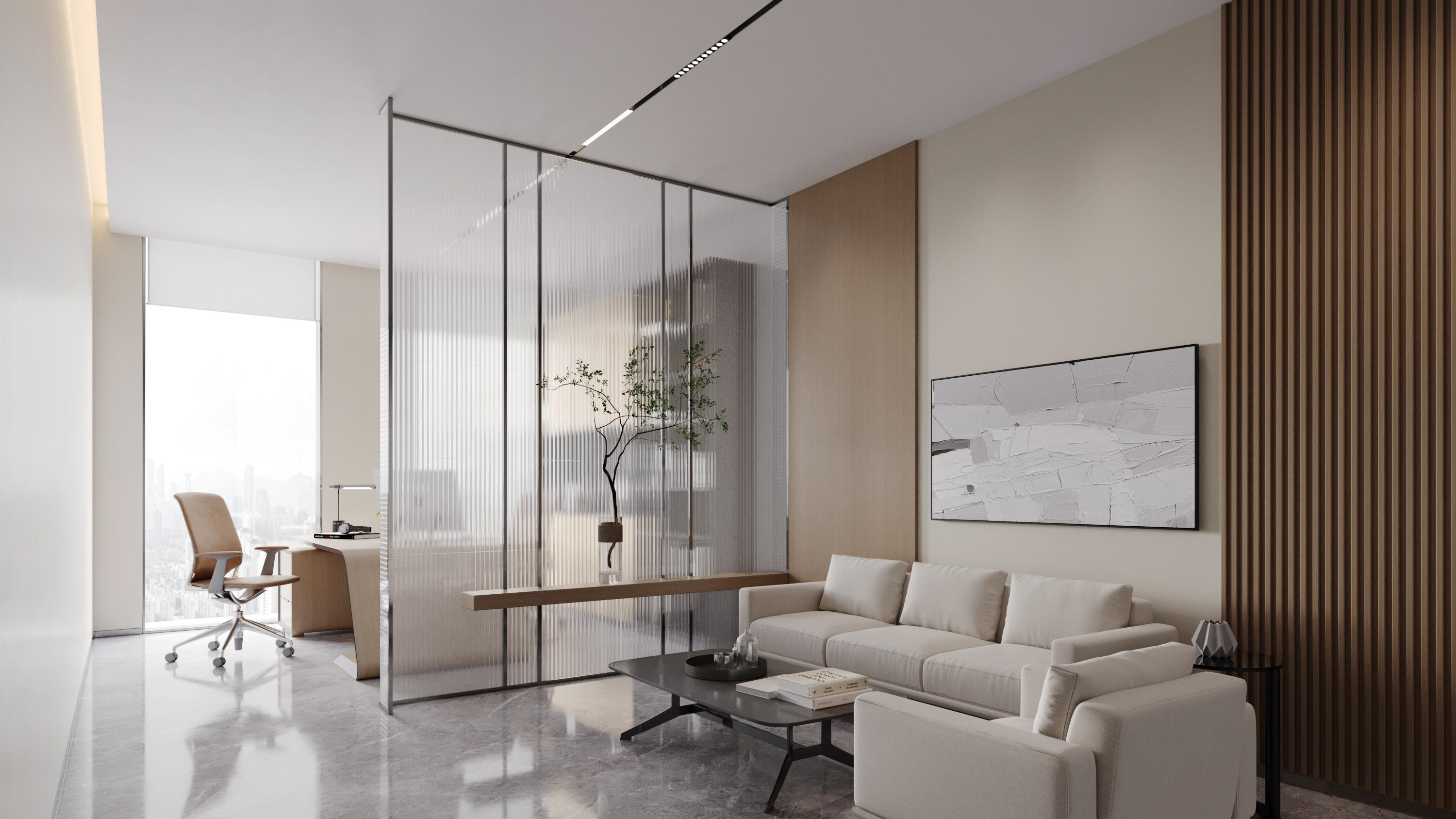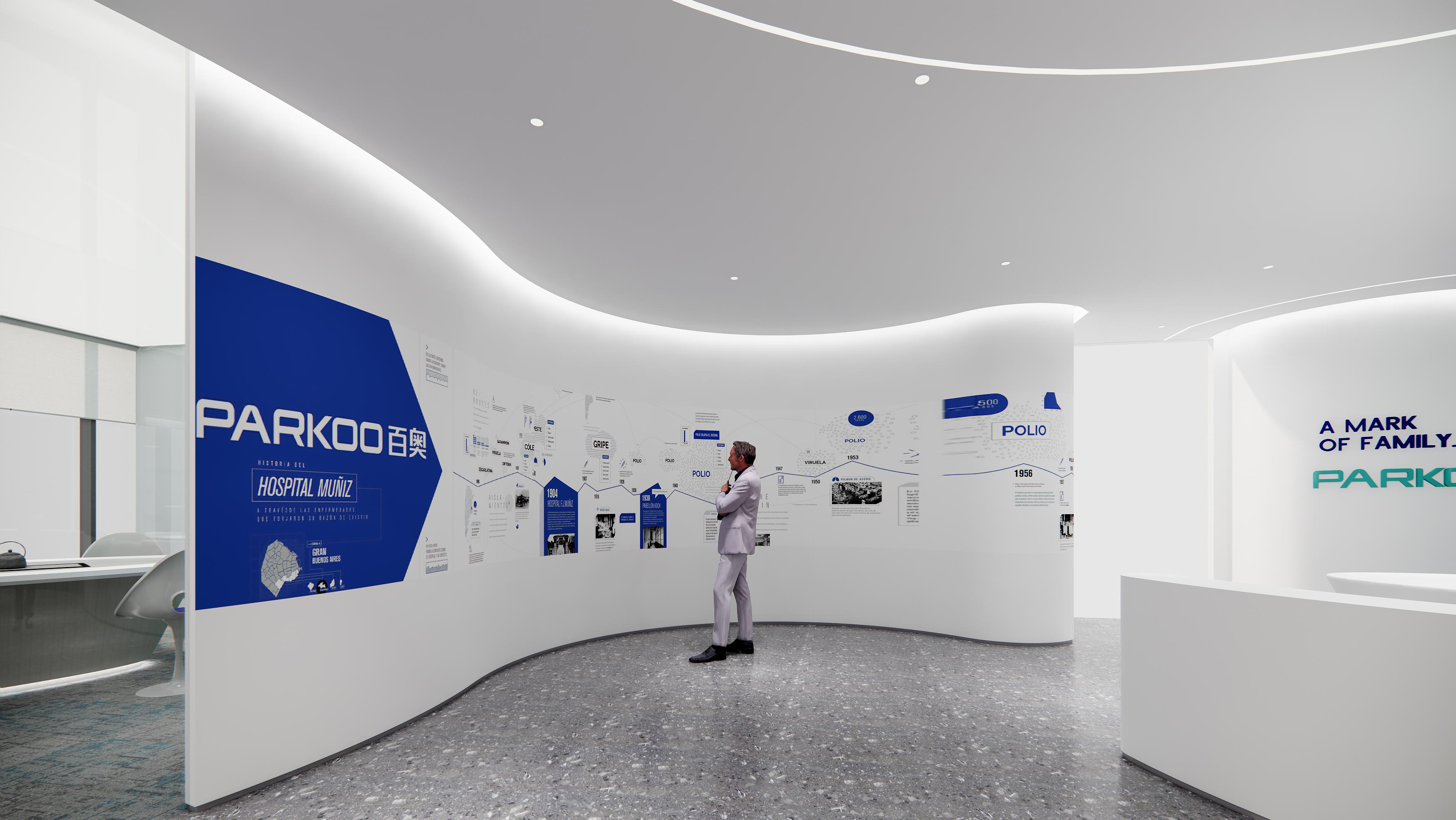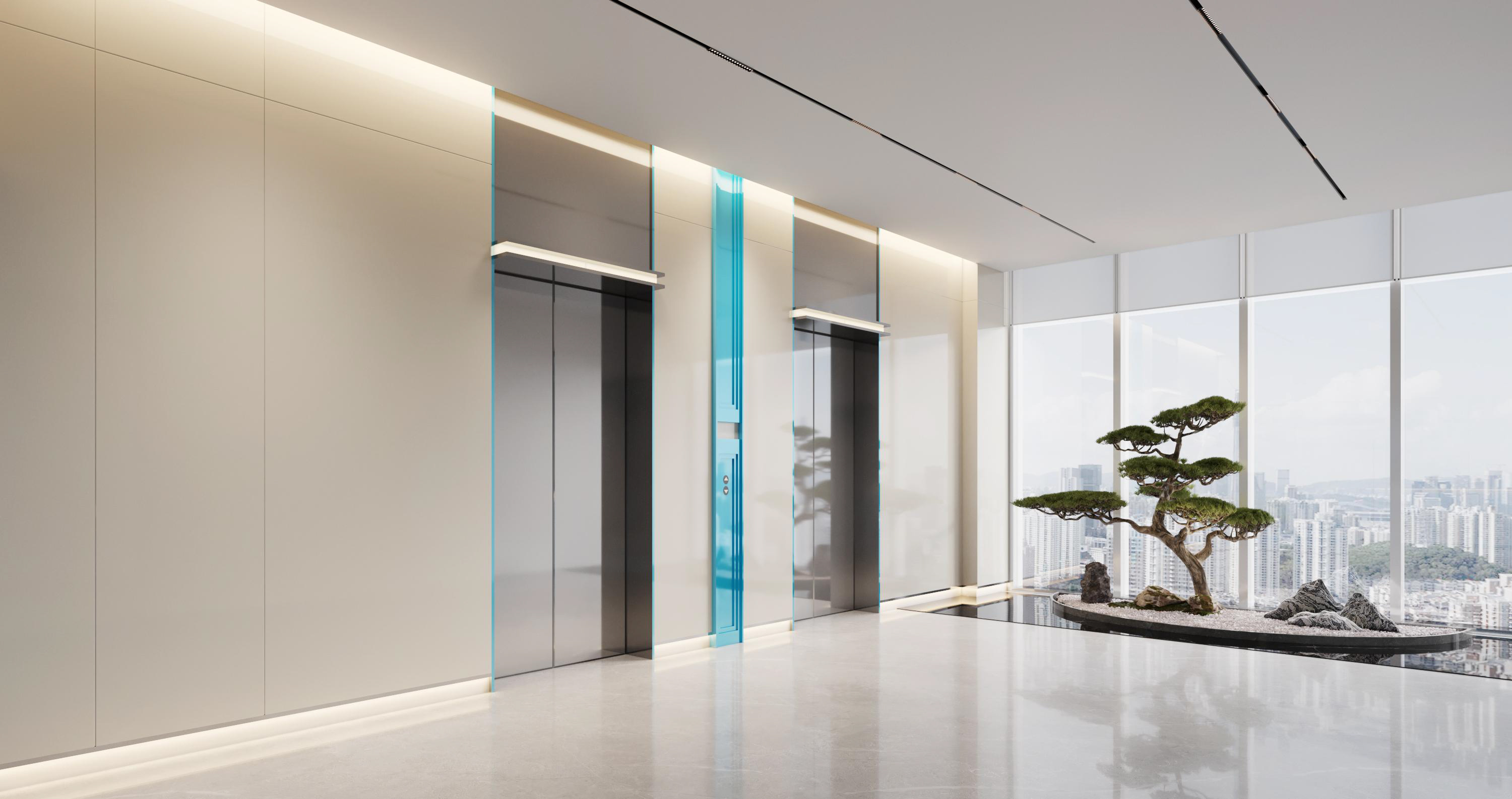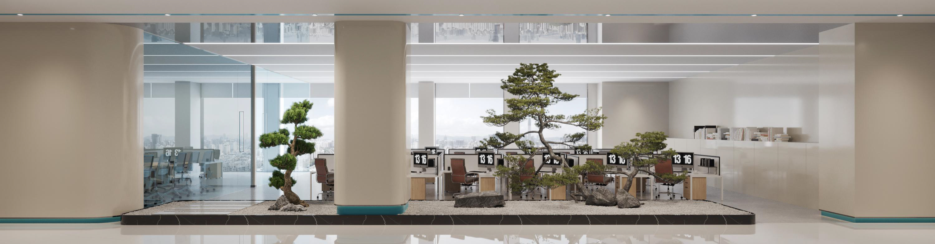 百奧集團(tuán)設(shè)計(jì)思路:前廳以暖色調(diào)為主,打造親和形象。墻壁、前臺(tái)采用紋路瓷磚,和兩側(cè)的綠植、假山等相互映襯,沉穩(wěn)大氣。會(huì)議室白色吊頂和木色家具形成強(qiáng)烈對(duì)比,干凈、簡約。通道用磨砂玻璃作為隔斷,保證隱私性的同時(shí),也增加了通透明亮。電梯間、通道、茶水間等隨處可見的綠植、假山等裝飾,增加了辦公室的自然色彩。展廳以灰白色調(diào)為主,再加上線條以及墻壁的流暢設(shè)計(jì),凸顯了展廳空間的科技感。
