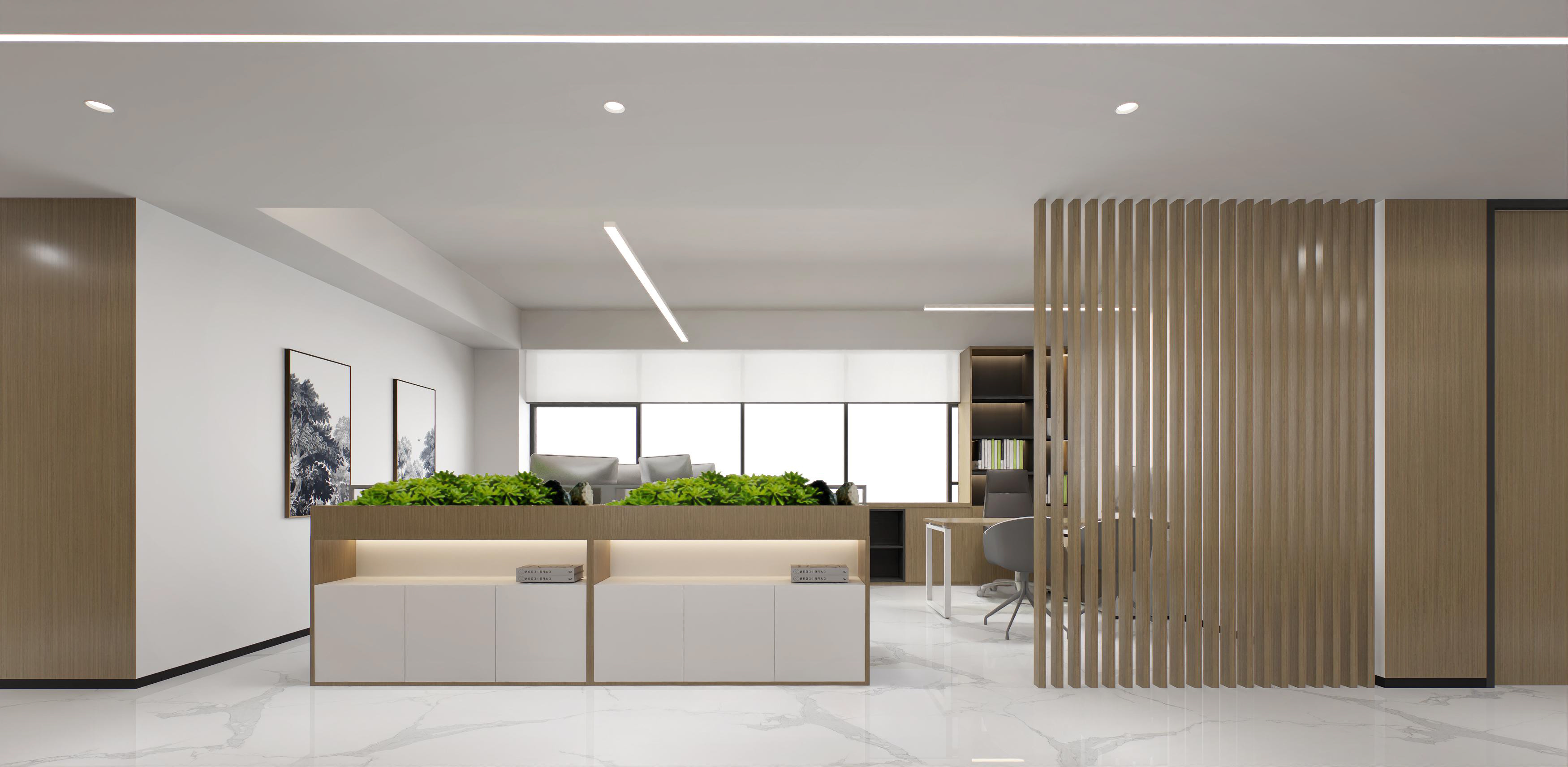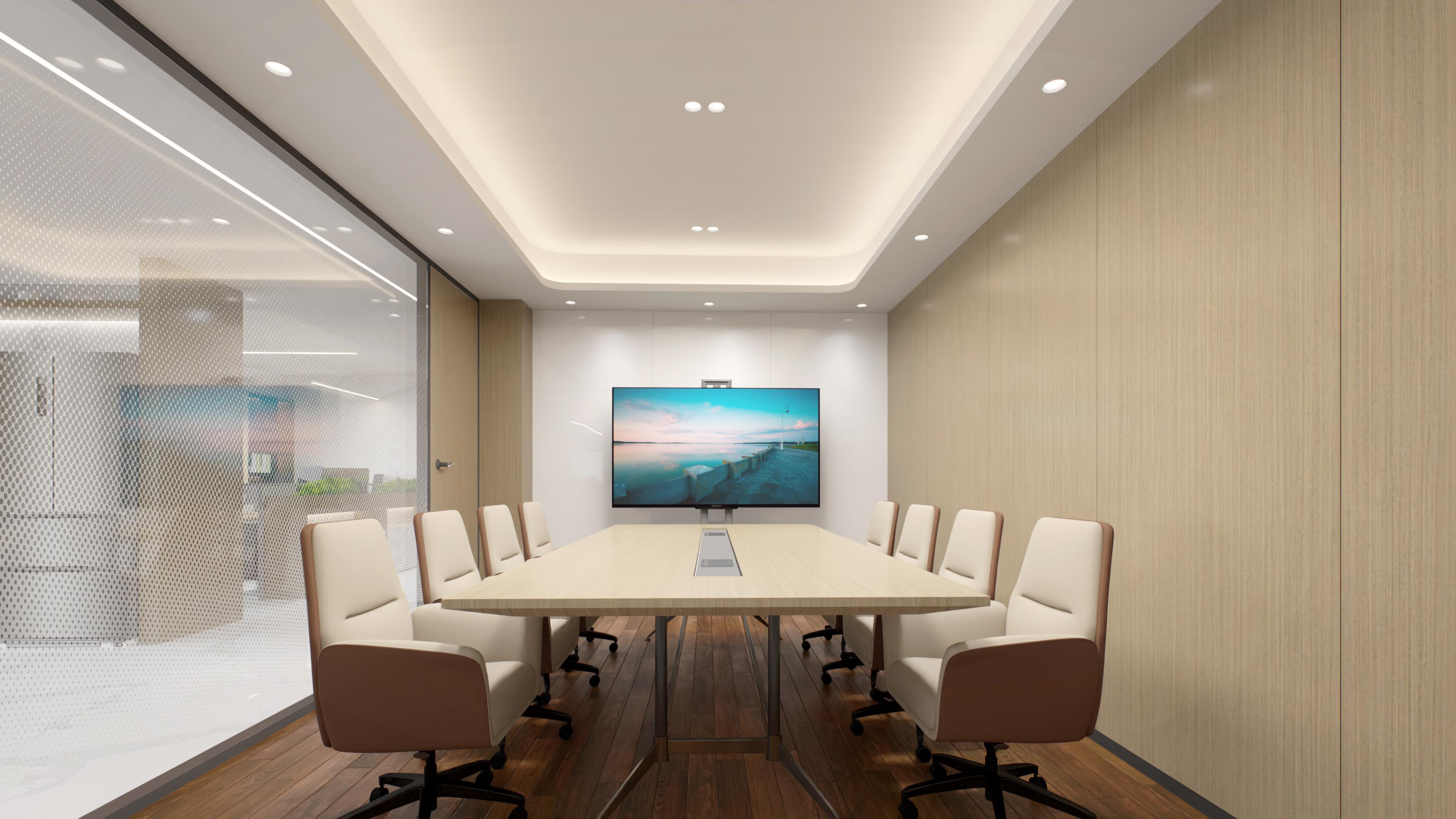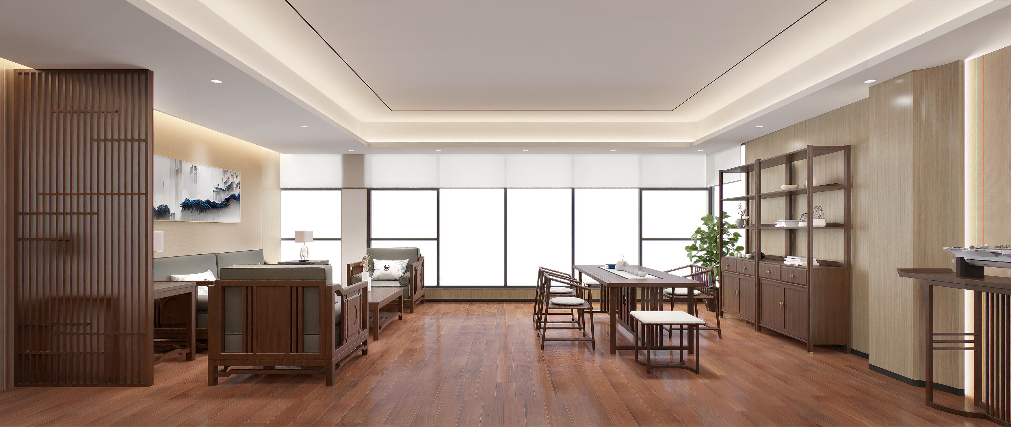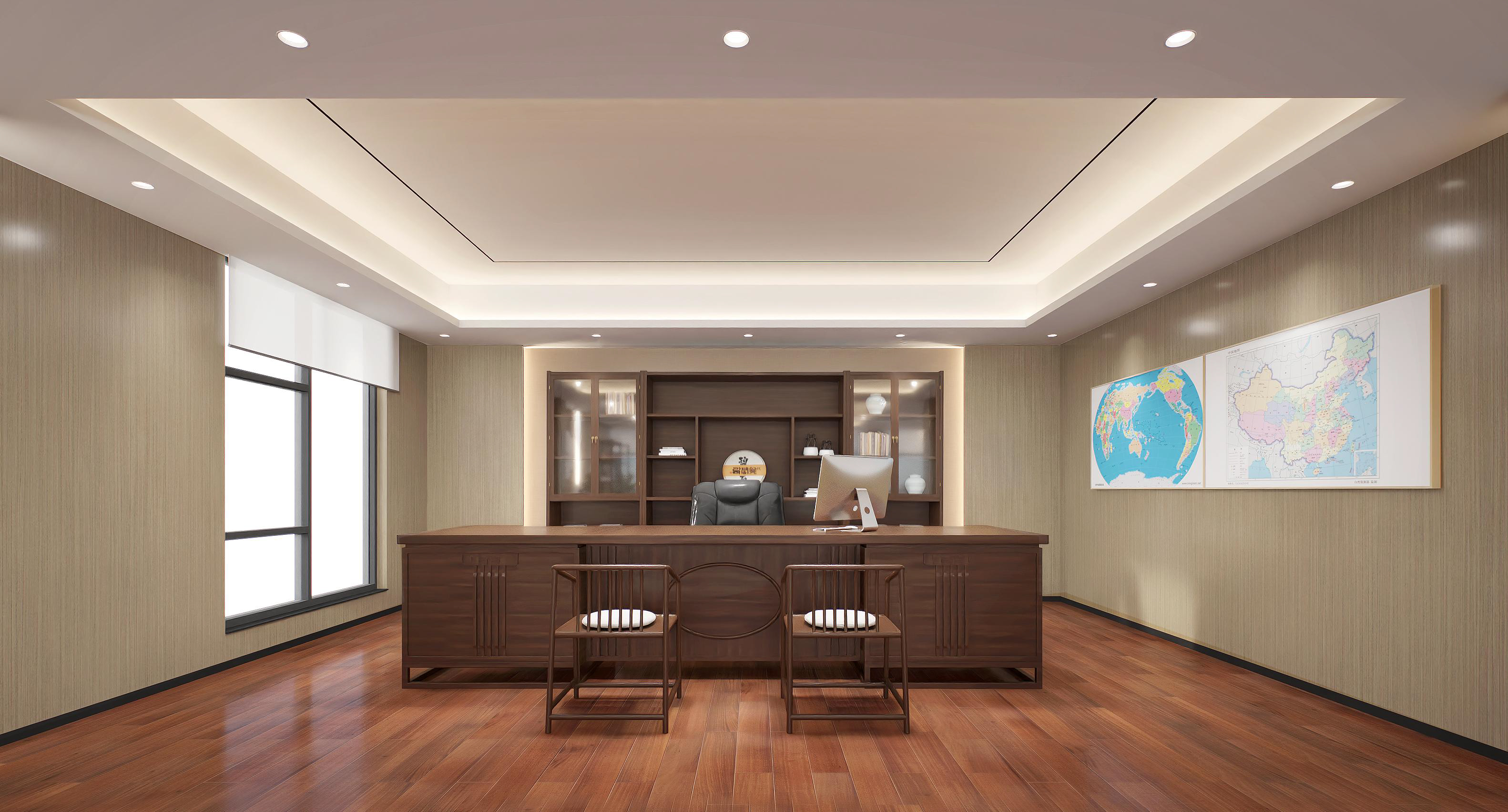 半包圍式的書吧設(shè)計(jì),為員工提供具有一定私密性的休閑空間,有利于員工的身心放松,同時(shí)也體現(xiàn)了企業(yè)的人文關(guān)懷。會議室以斑點(diǎn)玻璃作為隔斷,保證了空間的通透、明亮。整體以木色調(diào)為主,增加親和力。董事長辦公室以中式為主,凸顯沉穩(wěn)大氣感。