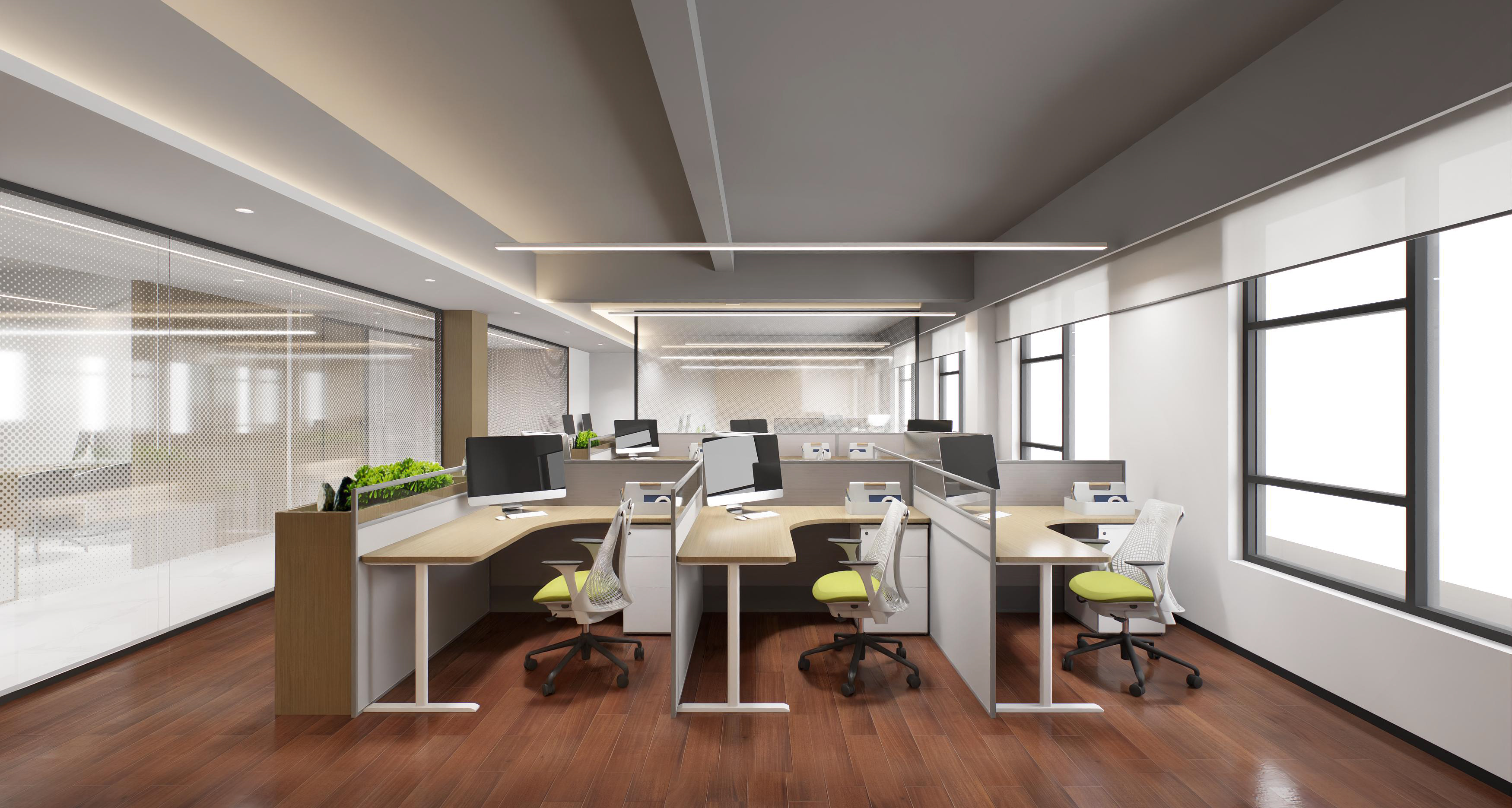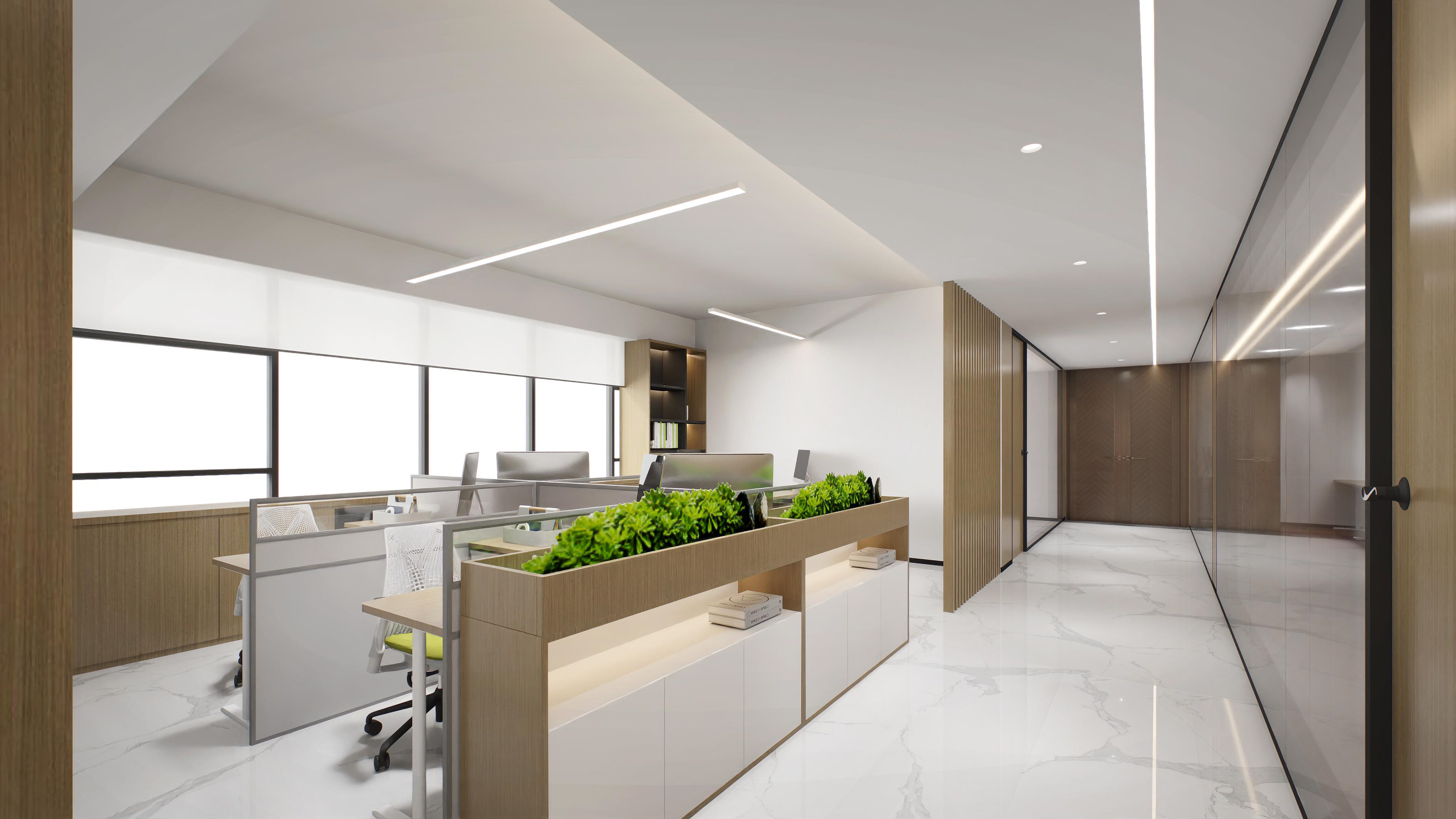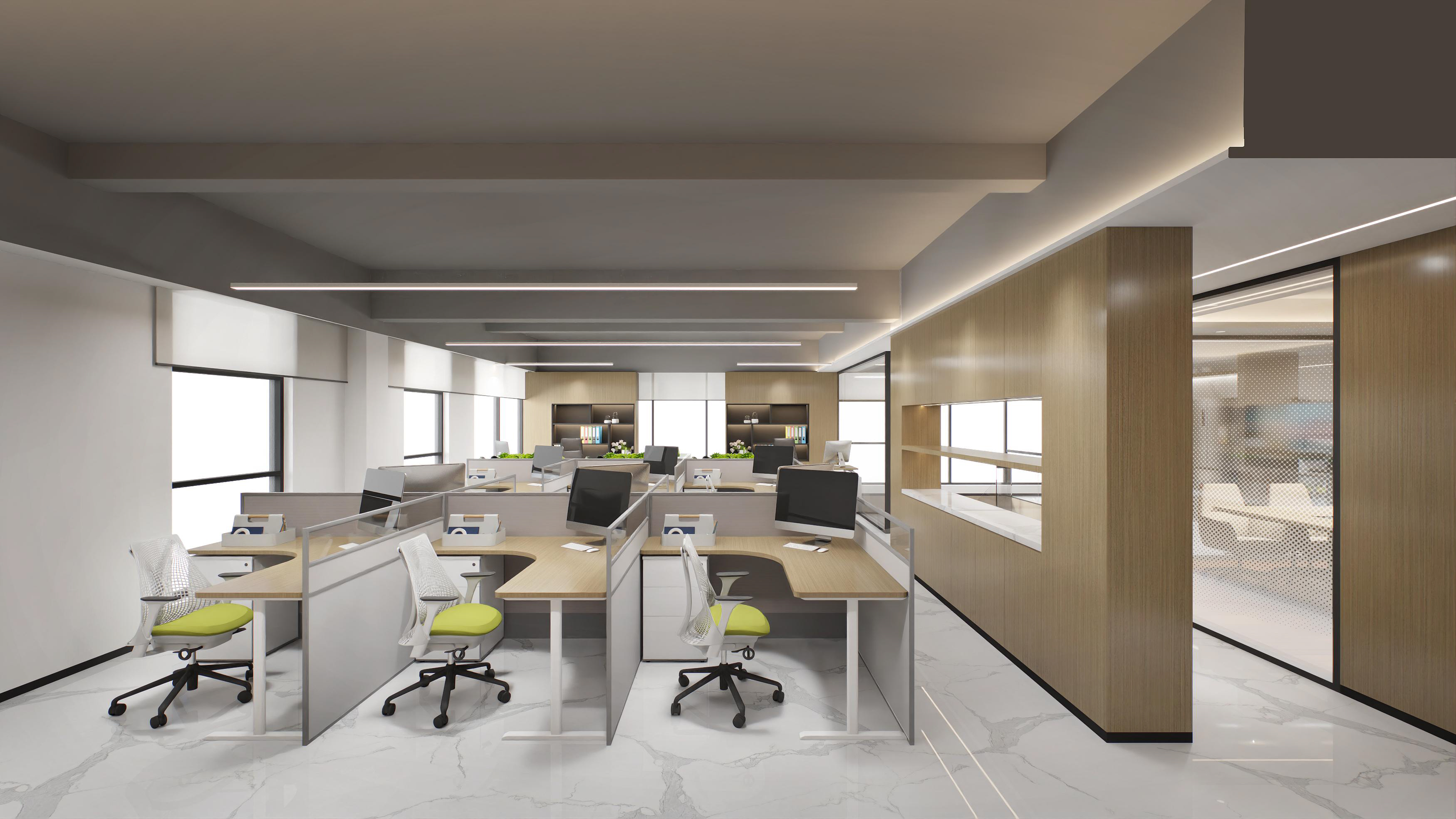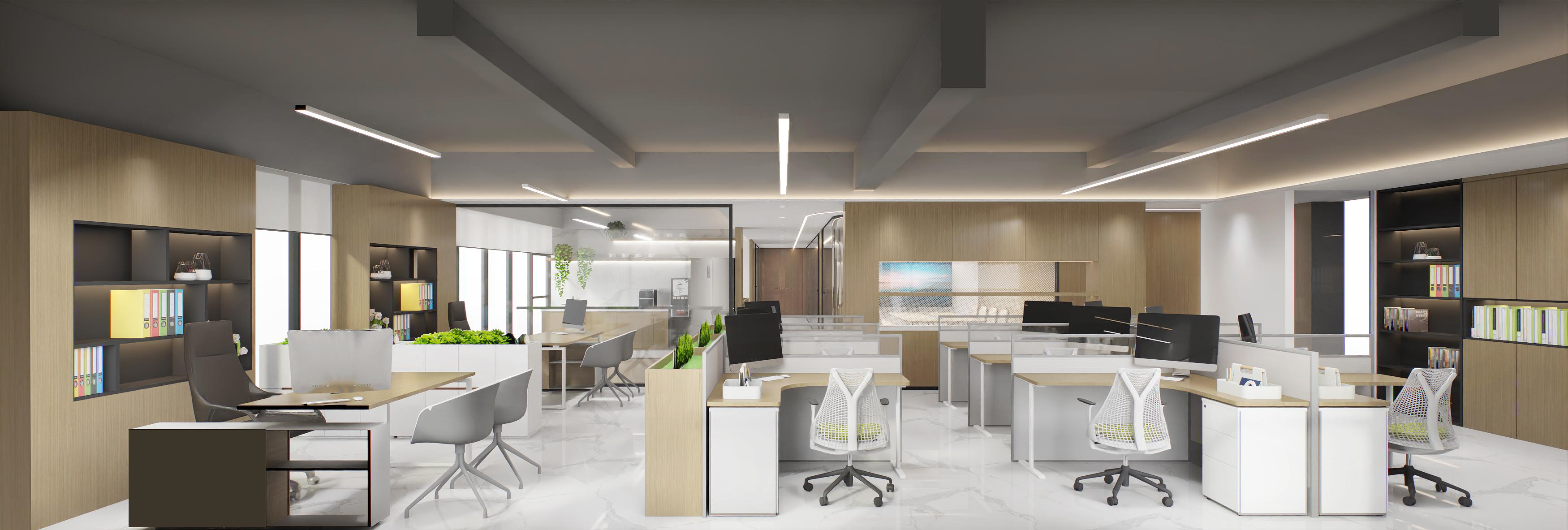 半包圍式的書吧設(shè)計(jì),為員工提供具有一定私密性的休閑空間,有利于員工的身心放松,同時(shí)也體現(xiàn)了企業(yè)的人文關(guān)懷。會議室以斑點(diǎn)玻璃作為隔斷,保證了空間的通透、明亮。整體以木色調(diào)為主,增加親和力。董事長辦公室以中式為主,凸顯沉穩(wěn)大氣感。