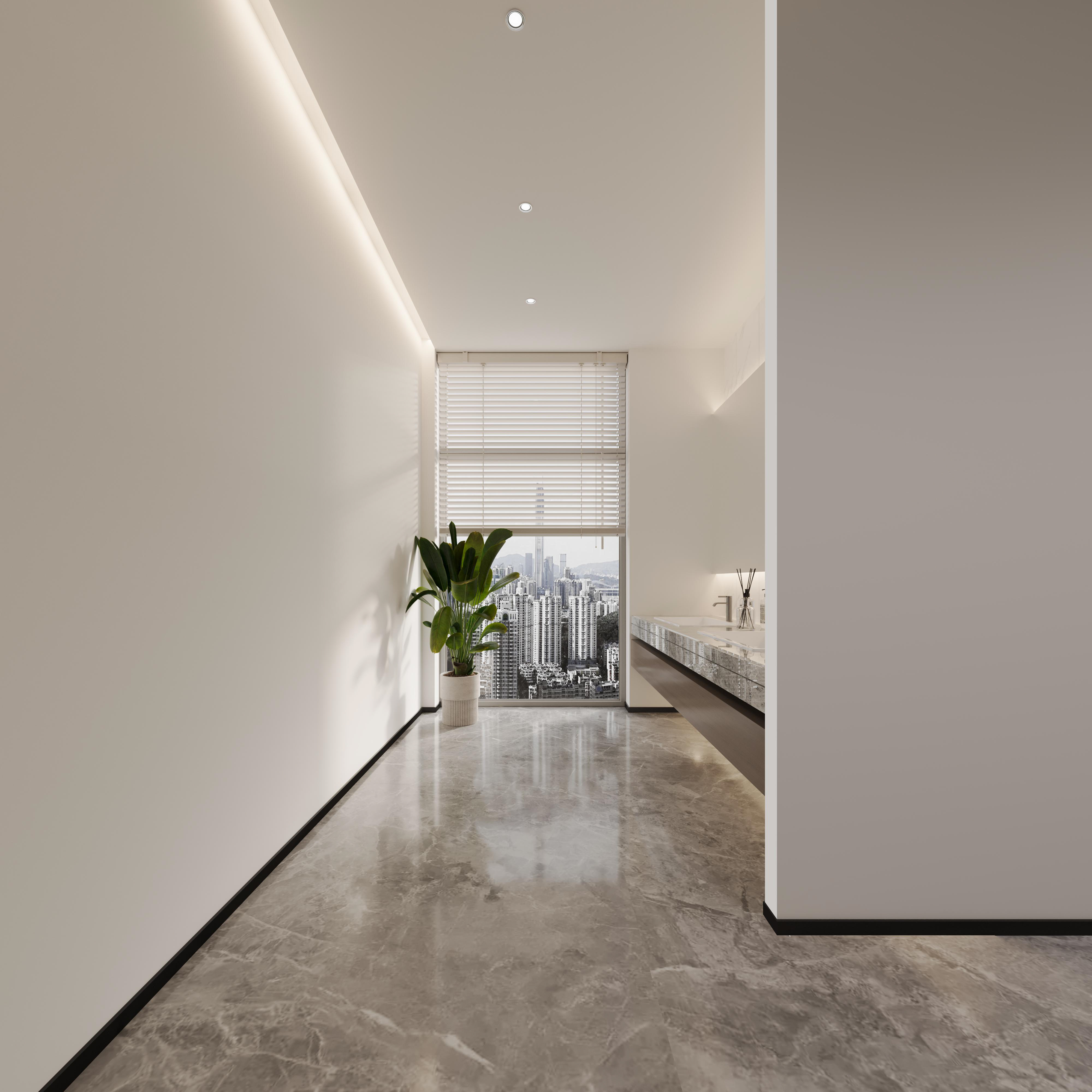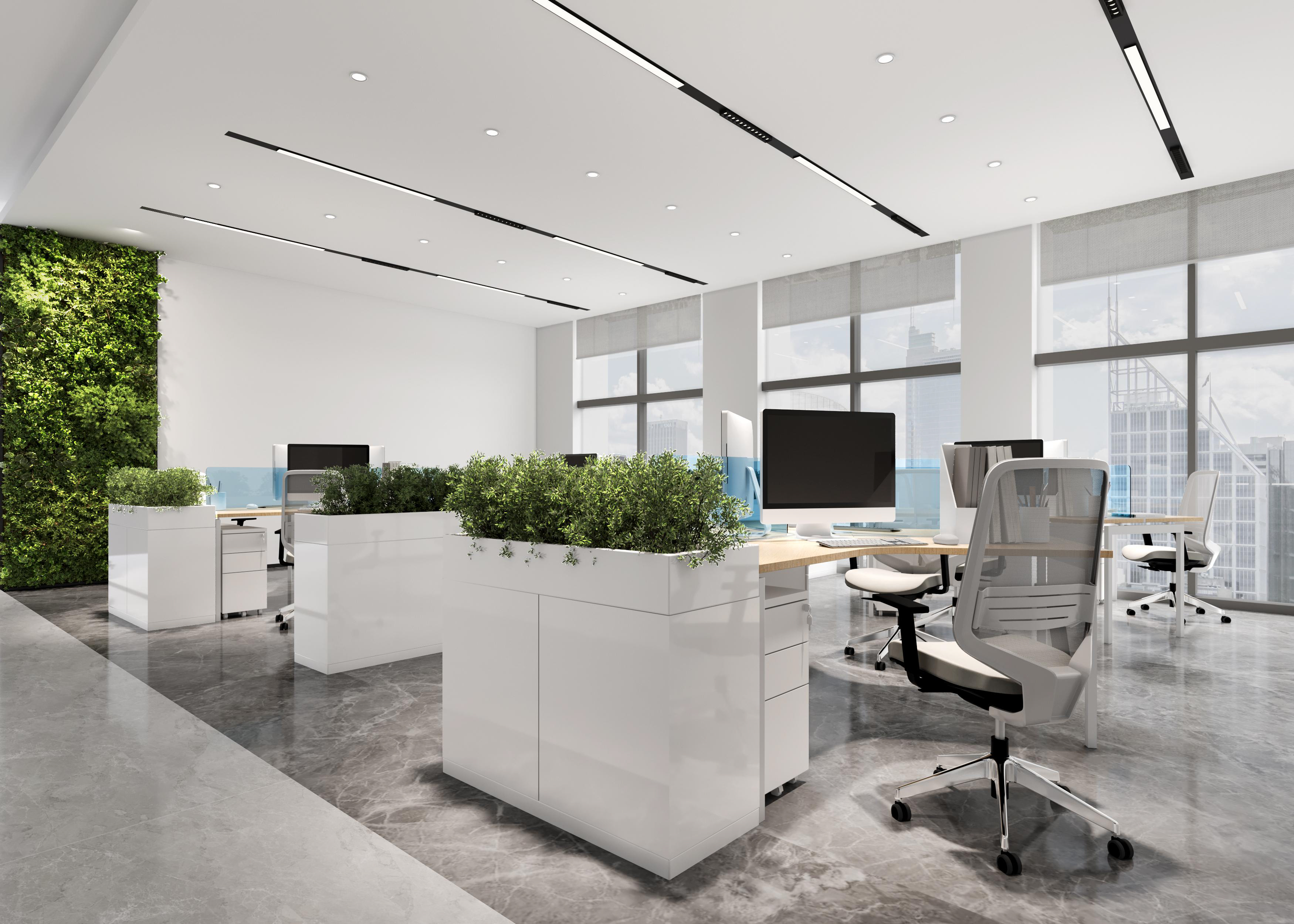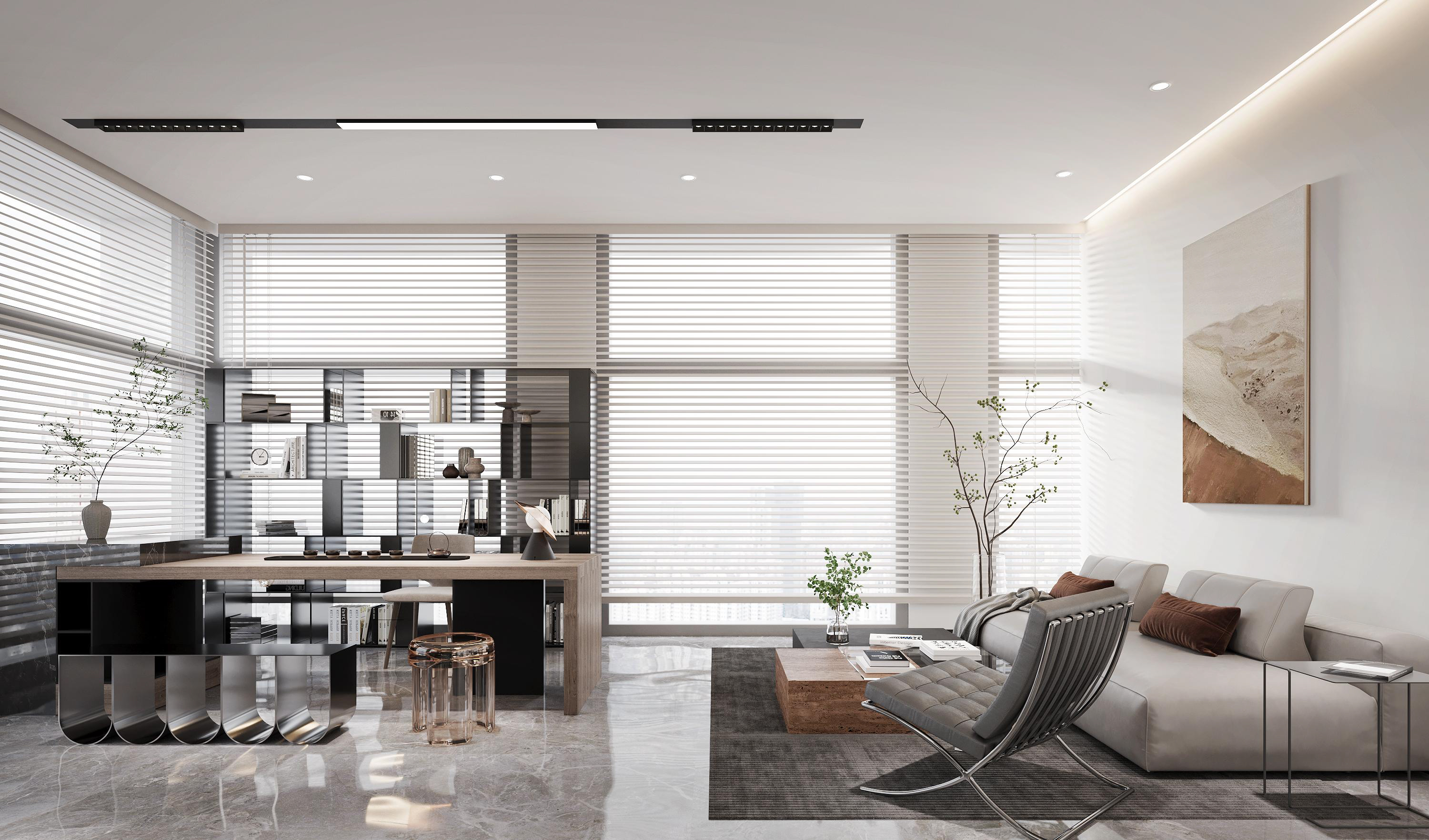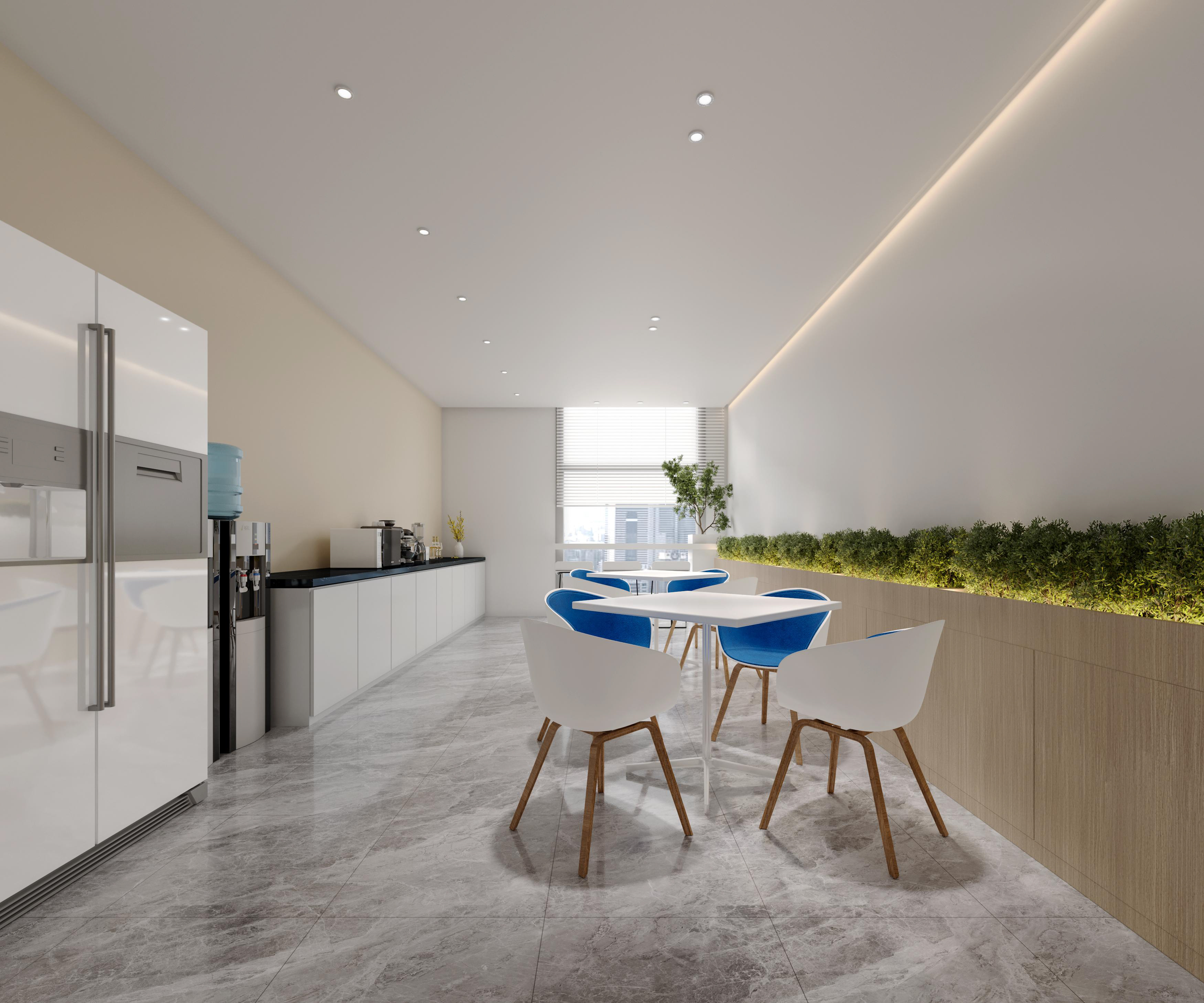 冷色為主色調(diào),營造簡約、現(xiàn)代感,光點增加動態(tài)感,增添活力。隱藏式照明,減少視覺上的雜亂,空間看起來更加簡潔。開放式辦公室,使空間開闊,玻璃隔斷,增加了辦公空間的通透、明亮。