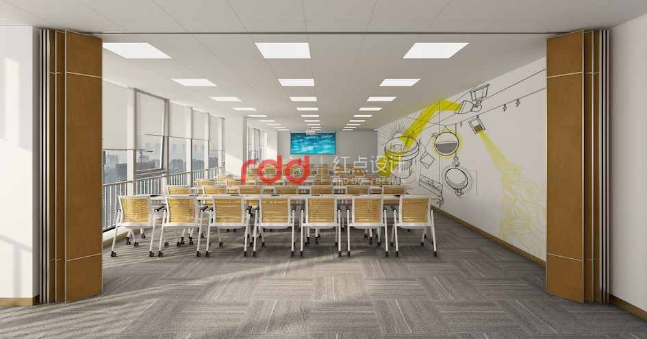 大會議室以簡潔為主,家具運用綠色的臨近時黃色,墻面也利用同類型的墻繪活躍氣氛。