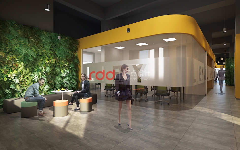 前臺(tái)休閑區(qū)是一個(gè)企業(yè)靈魂的體現(xiàn),也是靈感迸發(fā)的地方。年輕活躍的氛圍是最好的藥引,因此在色彩的設(shè)計(jì)上,設(shè)計(jì)師大膽運(yùn)用橙黃色,這一色調(diào)一致延伸到其他空間。