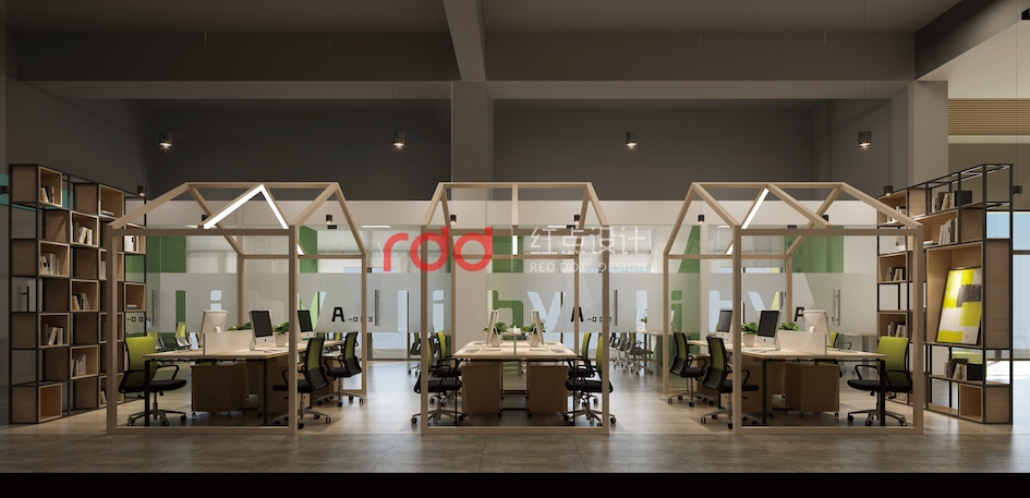 共享辦公區(qū)是最活躍且最具代表性的空間。設(shè)計(jì)師在每組卡座的上方設(shè)計(jì)了一個(gè)房子的造型,仿佛是每個(gè)溫馨的小家。