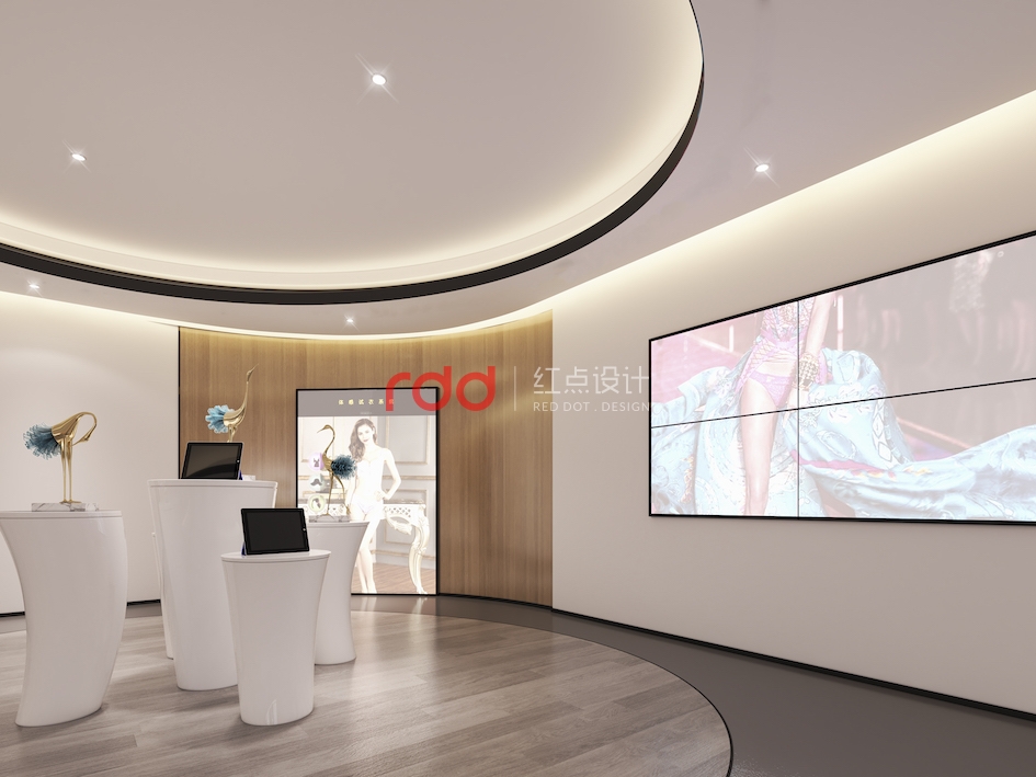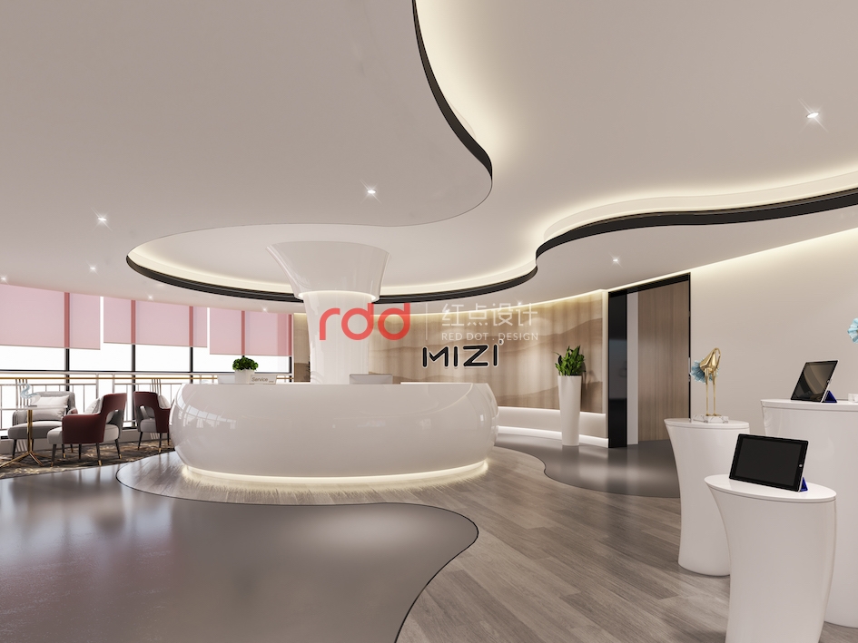 弧線是最能體現(xiàn)女性柔美的特征?;⌒吻芭_(tái)的設(shè)計(jì)猶如含苞待放的少女,亭亭玉立。背景墻上“MIZI”的發(fā)光logo簡(jiǎn)單大氣。