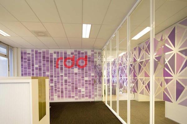 IT行業(yè)給人的印象是硬朗的,為了打破這樣的固定思維模式,紅點(diǎn)裝飾的設(shè)計(jì)師運(yùn)用黃色及紫色比較柔和的色彩來改變空間的氛圍。線條交錯(cuò)的白色鏤空隔斷圍合,形成相對獨(dú)立的空間。