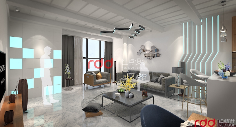 藍色強調(diào)科技、效率,表現(xiàn)出一種美麗、冷靜、理智、安詳與廣闊。因此在休閑和接待室,用藍色的線條、色塊來作點綴,結(jié)合燈光的效果,突出空間的科技感。