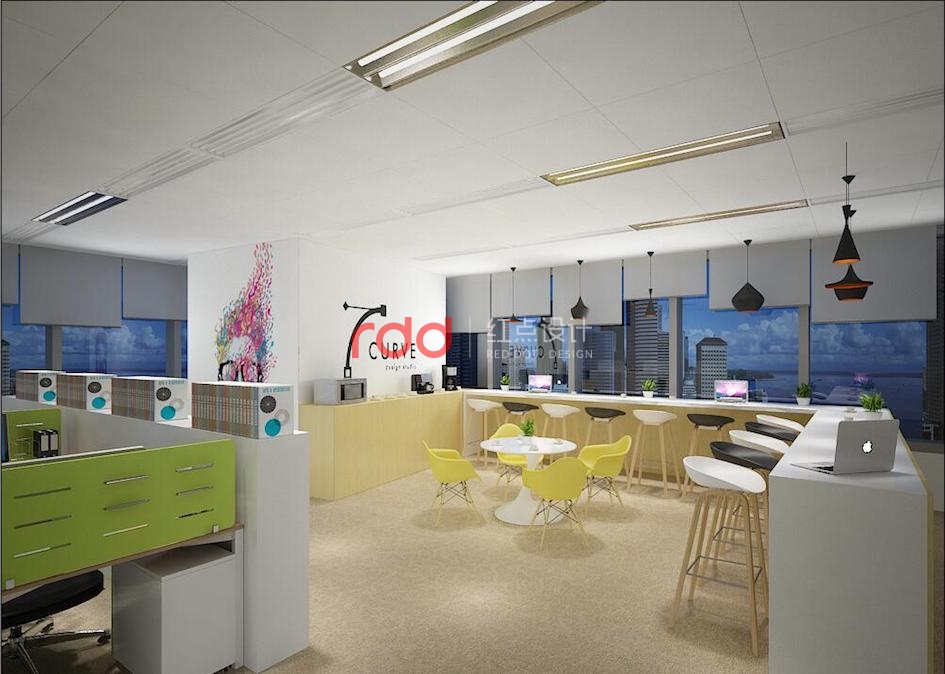“起秀”有后起之秀之意,這是一個充滿新鮮血液和新生年輕力量的公司。在簡約設計風格的同時,紅點裝飾的設計師運用相對活躍的顏色,藍色、黃色、粉色、綠色,這樣的顏色既年輕又能帶動環(huán)境的氛圍,墻面上五彩的圖案既能降低造價成本,又能出效果,可謂一舉兩得。