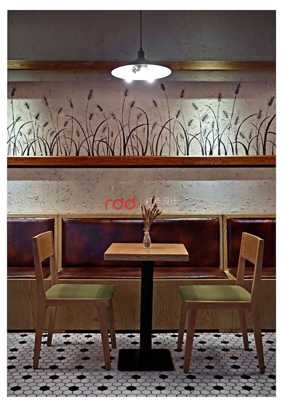 一字排開的桌椅沿著墻面,青草綠色的座椅與墻面麥浪相互映襯,橡木畫框圈起的藝術(shù)墻面回歸原始自然,燈光映射下的麥秸仿佛讓人聆聽到廣袤麥田下孩童嬉戲的笑聲,不管是大廳下的公共空間還是角落里的低吟沉思,麥田下的舒緩心境一直蔓延開來。