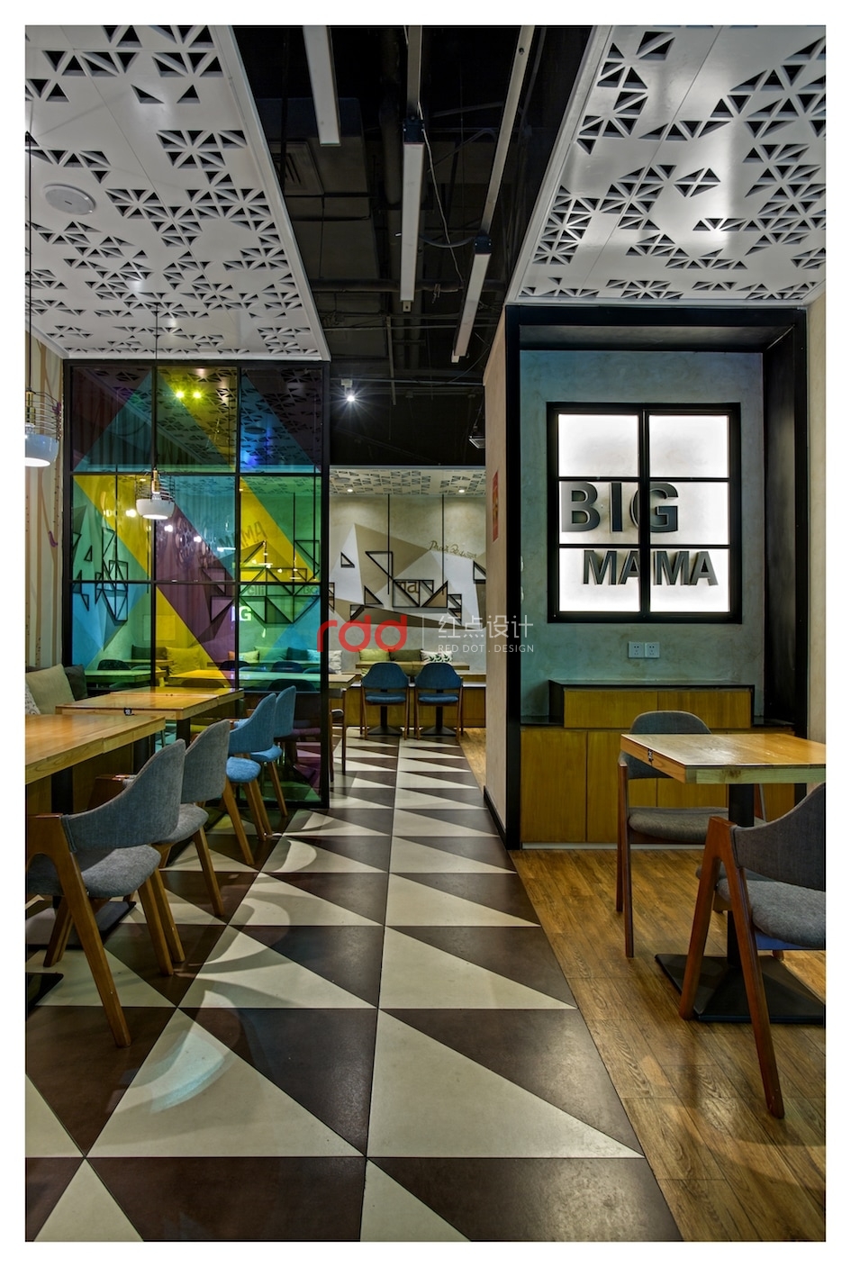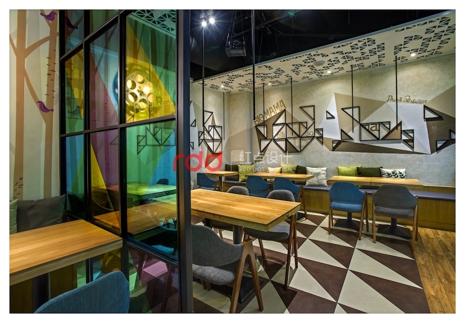 幾何元素被設(shè)計(jì)師大量使用:地板、天花上隨處可見的三角形,既突破了尋??臻g的方正視覺,又將俏皮與活力納入餐廳;壁燈則是別致的電影膠卷盤造型,投影在墻上恍若時(shí)光的印刻;桌面、落地窗則是矩形的代表,將絢麗多彩紛紛框進(jìn)空間,形成井井有條的秩序美感;狹長(zhǎng)的射燈遠(yuǎn)眺仿佛一條條墨線垂天而下,讓空間縱深感十足。不得不令人感慨,設(shè)計(jì)師對(duì)于快時(shí)尚餐飲的拿捏如此到位。