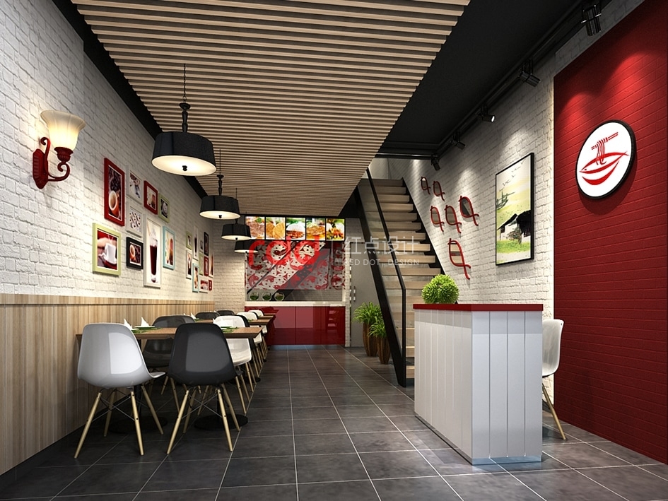 “魚頭王”顧名思義是以吃魚頭及與相關(guān)的產(chǎn)品為特色主食的餐廳,因此設(shè)計師以魚為主題,門頭運用魚鱗的形狀,重復(fù)排列而成,透過燈光效果,特點鮮明,整個門面兩層運用LOGO的紅色,遠(yuǎn)遠(yuǎn)望去,非常顯眼。推開如在水中游曳般魚狀的拉手大門,進入餐廳,紅白相間的文化磚墻,如魚骨的仿木紋鋁條天花,給人一絲用餐時的悠閑。