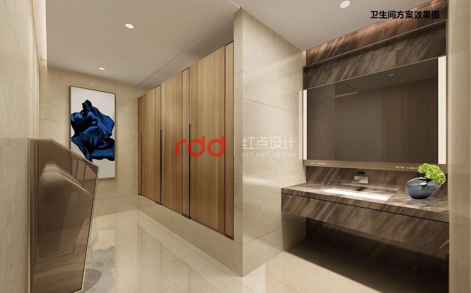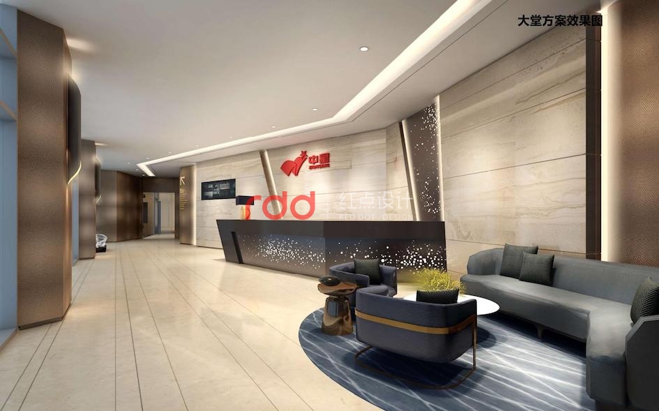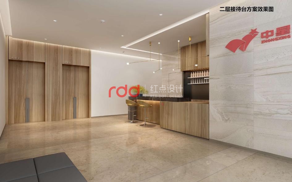 二三層接待吧臺與大廳講究整體的對稱平衡,通過巧妙的吧臺構(gòu)成形式、空間吊燈的位置,呈現(xiàn)靈動的立面關(guān)系,有效緩解空間的呆板。大面米黃色石材,配以紅色的LOGO,更醒目大方。