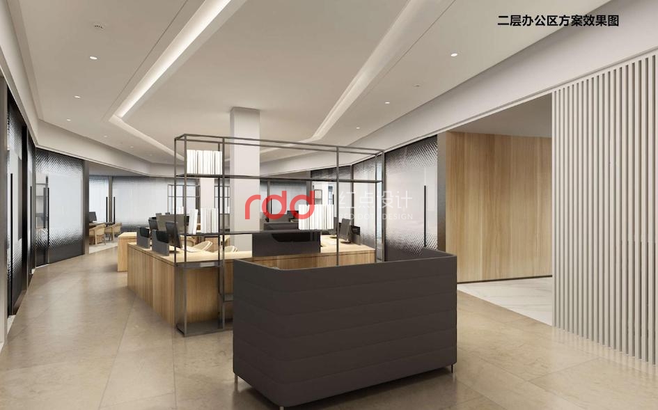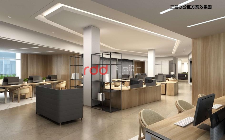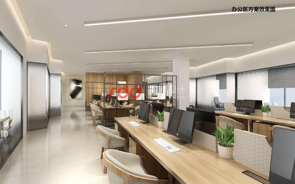 開放辦公區(qū)整體運用木飾面與白墻的有機結(jié)合,使整個空間更和諧。
