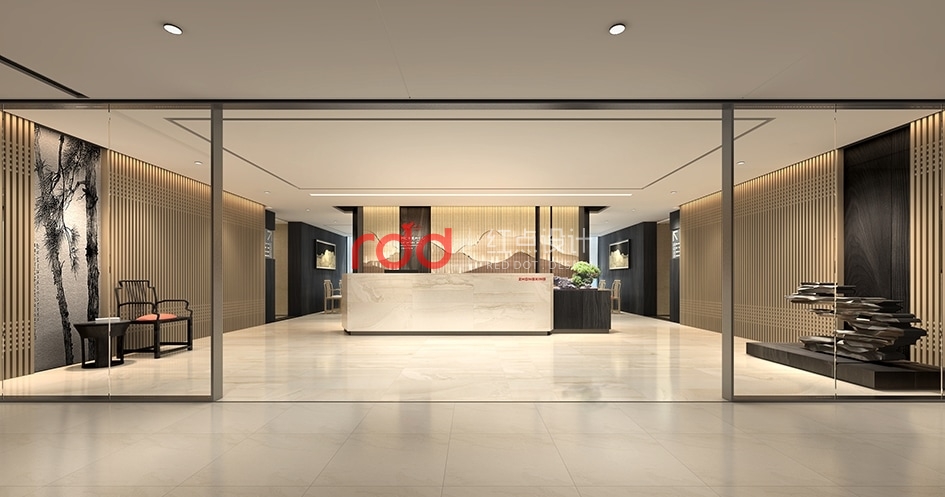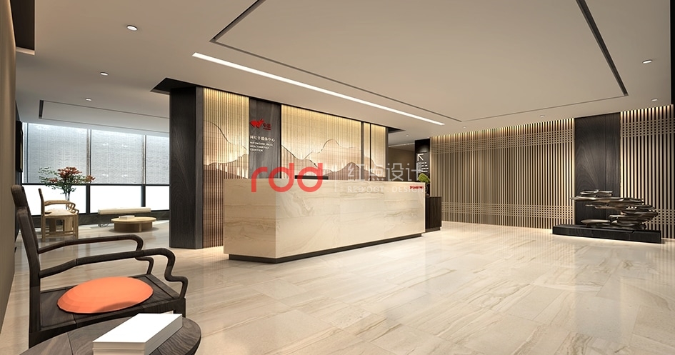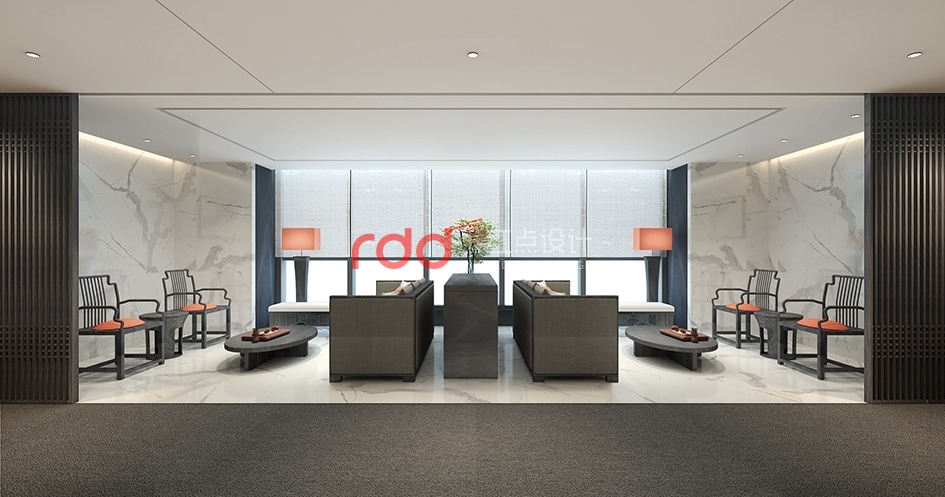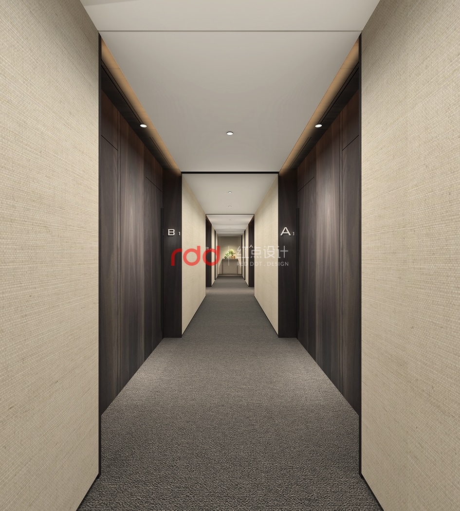 本案是由53間網(wǎng)紅直播間和2個大的休閑茶水區(qū)組成的辦公空間。此項目有別于其它的網(wǎng)紅工作室,因為這是廣州中星集團旗下的網(wǎng)紅多媒體中心,中星是以教育為主的,所以設(shè)計師以現(xiàn)代中式風格為主調(diào)。整體空間以木飾面為主,配合仿大理石地面和深灰色的印花地毯運用,空間增添幾分文雅的書香氣。