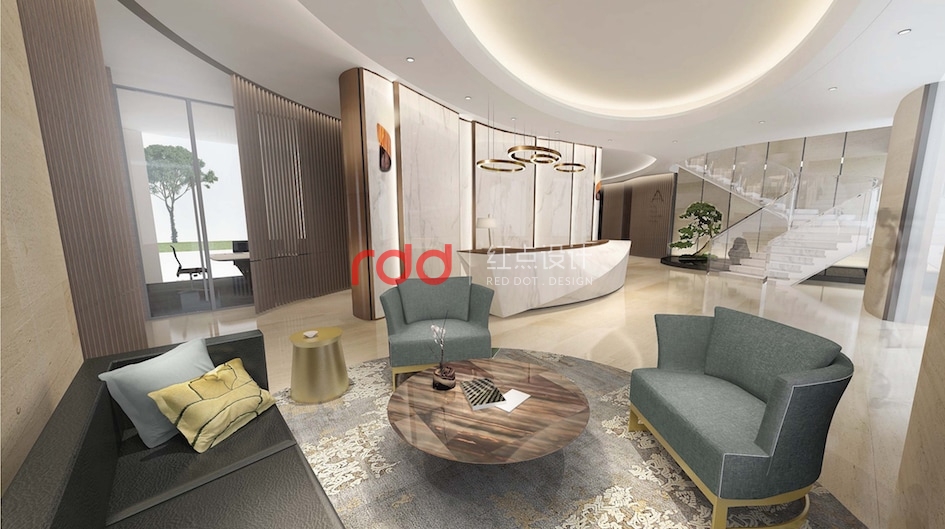 步入大堂,層層疊疊的弧形天花猶如海浪,條條整齊的仿木紋鋁格柵如竹子。白色弧形大理石背景墻及異型大理石前臺(tái)仿佛帆船一樣在破浪前行。“長(zhǎng)風(fēng)破浪會(huì)有時(shí),直掛云帆濟(jì)滄海?!敝杏腿欢?。