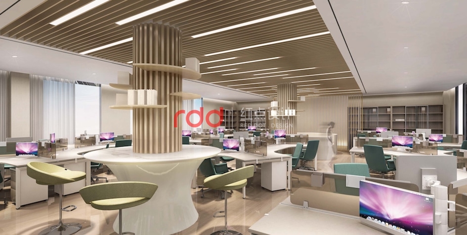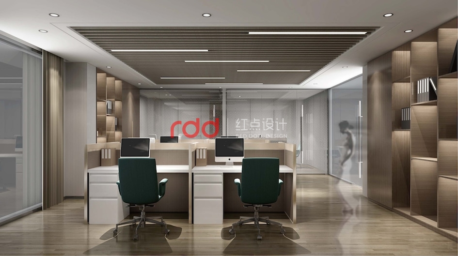 通過(guò)對(duì)二層辦公區(qū)動(dòng)線分析,紅點(diǎn)裝飾設(shè)計(jì)的設(shè)計(jì)師以多邊形為元素,在開(kāi)放辦公區(qū)運(yùn)用不同多邊形拆分、組合,形成一個(gè)相對(duì)活躍的辦公空間,仿木紋鋁格柵從天花一直延伸到立面,圍合成一個(gè)半開(kāi)放半私密的環(huán)境,藍(lán)綠色的椅子為點(diǎn)睛之筆,讓整個(gè)空間增添了幾分樂(lè)趣。