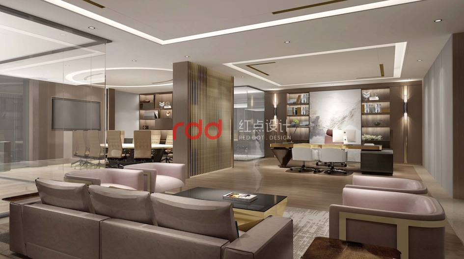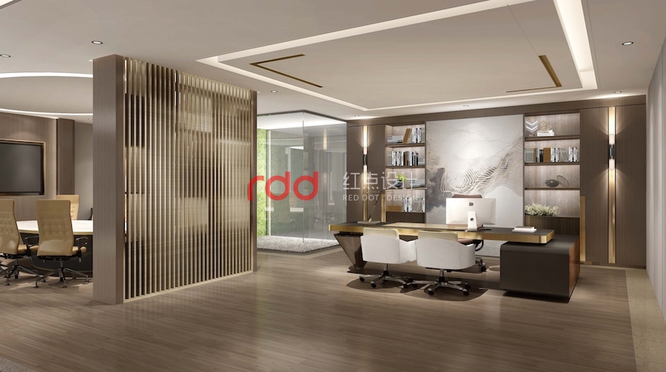 CEO辦公室是三層的重點(diǎn),整個(gè)辦公室內(nèi)辦公、接待、會(huì)議功能俱全,加上陽(yáng)臺(tái)及端景的戶外休閑空間就更加完美了。會(huì)議室與辦公區(qū)運(yùn)用柜子及格柵來(lái)形成一個(gè)既開(kāi)放又相對(duì)獨(dú)立的空間。辦公桌后面的柜子具有收納功能的同時(shí)也兼具裝飾的的效果,這樣的布局在風(fēng)水上有背山靠水,春暖花開(kāi)之意。
